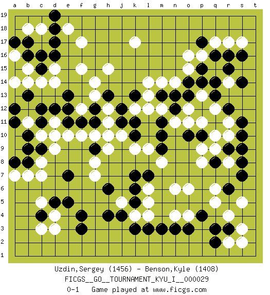 Last move : 0-1 2010 June 15 8:1:11 [Event "FICGS__GO__TOURNAMENT_KYU_I__000029"] [Site "FICGS"] [Date "2010.06.02"] [Round "1"] [Black "Uzdin,Sergey"] [White "Benson,Kyle"] [Result "0-1"] [Rating 1 "1456"] [Rating 2 "1408"] 1.q16 d3 2.d16 r4 3.d5 c7 4.c9 c5 5.f4 d4 6.p4 q6 7.r3 s3 8.q3 s5 9.m3 r14 10.r12 r17 11.r16 q17 12.p17 s17 13.s16 p16 14.s14 q15 15.p15 o16 16.q14 o15 17.p14 k17 18.r9 f17 19.o14 n14 20.n13 m14 21.m13 l14 22.d12 c14 23.c15 d14 24.d17 f15 25.j4 o6 26.s7 r2 27.q2 s2 28.f3 l4 29.l3 k4 30.k3 j5 31.h4 p9 32.k5 l5 33.k6 l6 34.k7 o12 35.o13 f12 36.h13 h15 37.e13 b15 38.b16 d15 39.c16 g13 40.c12 g14 41.b8 b7 42.j12 r10 43.s10 r8 44.s8 q9 45.s9 r11 46.s11 q12 47.q13 d9 48.d10 c8 49.b9 e10 50.e11 c10 51.c11 d11 52.b10 d10 53.b13 b14 54.a12 b11 55.a8 a7 56.a11 e18 57.d18 a16 58.a17 b18 59.a15 a14 60.d19 a16 61.b17 c18 62.l7 o4 63.o3 n4 64.r6 q5 65.n3 n6 66.e5 g7 67.c4 c3 68.h6 h9 69.h10 g10 70.g9 g8 71.g11 f10 72.f11 h11 73.e12 j10 74.e7 k12 75.k13 l13 76.k11 l12 77.j11 h10 78.k10 k9 79.g12 h12 80.m10 l9 81.m11 m12 82.n12 n11 83.p12 o11 84.m9 m8 85.o10 p11 86.p10 q10 87.q8 p13 88.r15 p8 0-1 Here are the names of the openings (joseki) played in the four corners : Corner d4 : d3 d5 Komoku (Somok, Xiao~mu`) 3-4 Point. The komoku (3-4) point is the traditional corner enclosure move.. Ikken Takagakari (Hankan Nop'dakeolch'im, Yi Gaogua`jiao~, 1-Space High Approach). The 5-4 approach move has become more popular in modern times, as modern Go emphasizes speed and influence. Corner q4 : r4 p4 Komoku (Somok, Xiao~mu`) 3-4 Point. The komoku (3-4) point is the traditional corner enclosure move.. Ikken Takagakari (Hankan Nop'dakeolch'im, Yi Gaogua`jiao~, 1-Space High Approach). The 5-4 approach move has become more popular in modern times, as modern Go emphasizes speed and influence. Corner q16 : q16 r14 Hoshi (Hwajeom, Seongjeom, Xingwei`) 4-4 Point. The star or hoshi (4-4) point, emphasizing influence at the potential expense of territory. Ikken Kakari (Hankan Keolch'im, Yi Gua`jiao~, 1-Space Low Approach). White 2 is the standard approach move to the 4-4. Corner d16 : d16 f17 Hoshi (Hwajeom, Seongjeom, Xingwei`) 4-4 Point. The star or hoshi (4-4) point, emphasizing influence at the potential expense of territory. Ikken Kakari (Hankan Keolch'im, Yi Gua`jiao~, 1-Space Low Approach). White 2 is the standard approach move to the 4-4. Player White won this Go (weiqi, baduk) game. Follow this game move after move (download)Do not fear furikawari. (Anonymous) What doesn't kill us makes us stronger. (Friedrich Nietzsche)