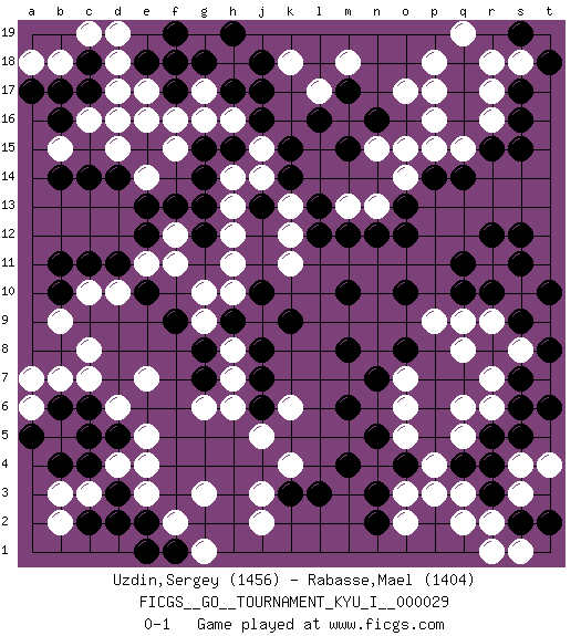 Last move : 0-1 2010 June 15 13:32:28 [Event "FICGS__GO__TOURNAMENT_KYU_I__000029"] [Site "FICGS"] [Date "2010.06.02"] [Round "1"] [Black "Uzdin,Sergey"] [White "Rabasse,Mael"] [Result "0-1"] [Rating 1 "1456"] [Rating 2 "1404"] 1.q16 d16 2.q4 d4 3.q10 o17 4.m17 r17 5.q17 r16 6.r15 r18 7.q18 q15 8.s15 p16 9.s16 p18 10.s17 s18 11.q14 p15 12.t18 q19 13.p14 o14 14.o13 n13 15.o12 n15 16.n12 m13 17.j17 g17 18.h15 h16 19.j16 j15 20.k15 j14 21.h17 g16 22.g18 f18 23.h19 k18 24.j18 l17 25.l16 m18 26.k14 k13 27.j13 h14 28.l13 k12 29.l12 k11 30.m15 d10 31.m12 k4 32.c14 c16 33.c11 c10 34.d11 e11 35.e12 f12 36.e13 f11 37.g15 f15 38.g14 h13 39.e18 e17 40.f19 d18 41.f17 f16 42.e15 f18 43.b10 b9 44.f17 e16 45.b11 e14 46.d14 d15 47.g13 h12 48.f13 c8 49.c18 d19 50.c17 f18 51.s19 p17 52.f17 d17 53.b16 b15 54.a17 b18 55.b19 c19 56.b17 a18 57.a19 b18 58.b14 a18 59.d3 e3 60.c4 e4 61.c5 d6 62.d5 e5 63.c6 c7 64.d2 o3 65.m4 o5 66.m6 k6 67.e2 f2 68.k9 q6 69.r5 q2 70.r3 o7 71.m8 h10 72.h9 s10 73.r8 r6 74.s11 r2 75.s2 s8 76.s7 r9 77.s6 r11 78.s12 q9 79.r12 r7 80.q11 s4 81.t8 q8 82.s5 s3 83.t2 s1 84.r4 t7 85.t6 t4 86.t10 t9 87.s9 h7 88.r10 p3 89.f9 j9 90.j10 g10 91.j8 g9 92.m10 g3 93.k3 j3 94.l3 j2 95.n2 o2 96.o4 p4 97.n3 q5 98.g12 h11 99.o8 q3 100.f18 r1 101.n7 o6 102.e10 e7 103.g8 h8 104.g7 g6 105.j7 h6 106.j6 j5 107.n16 o15 108.n5 p9 109.o10 b7 110.b6 a6 111.a5 a7 112.f1 g1 113.e1 c3 114.c2 b3 115.b4 b2 0-1 Here are the names of the openings (joseki) played in the four corners : Corner q16 : q16 o17 Hoshi (Hwajeom, Seongjeom, Xingwei`) 4-4 Point. The star or hoshi (4-4) point, emphasizing influence at the potential expense of territory. Ikken Kakari (Hankan Keolch'im, Yi Gua`jiao~, 1-Space Low Approach). White 2 is the standard approach move to the 4-4. Corner d16 : d16 j17 Hoshi (Hwajeom, Seongjeom, Xingwei`) 4-4 Point. The star or hoshi (4-4) point, emphasizing influence at the potential expense of territory. Corner q4 : q4 o3 Hoshi (Hwajeom, Seongjeom, Xingwei`) 4-4 Point. The star or hoshi (4-4) point, emphasizing influence at the potential expense of territory. Ikken Kakari (Hankan Keolch'im, Yi Gua`jiao~, 1-Space Low Approach). White 2 is the standard approach move to the 4-4. Player White won this Go (weiqi, baduk) game. Follow this game move after move (download)Keshi is worth as much as an invasion ! (Anonymous) The best teachers teach from the heart, not from the book. (Author unknown)