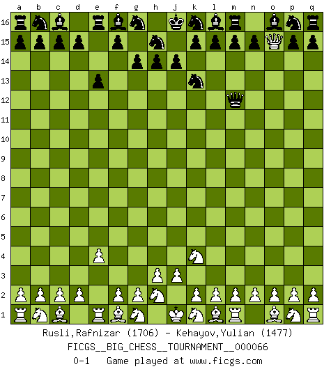 Last move : 0-1 2010 July 14 3:15:52 [Event "FICGS__BIG_CHESS__TOURNAMENT__000066"] [Site "FICGS"] [Date "2010.06.03"] [Round "1"] [White "Rusli,Rafnizar"] [Black "Kehayov,Yulian"] [Result "0-1"] [WhiteElo "1706"] [BlackElo "1477"] 1.j2-k4 j15-k13 2.h1-o7 g15-g14 3.o7-o15 e15-e13 4.e2-e4 h16-m12 0-1 Follow this game move after move (download)Of Chess it has been said that life is not long enough for it, but that is the fault of life, not Chess. (William Ewart Napier) Im Schach gewinnt jeder. Hat man Freunde am Spiel - und das ist die Hauptsache - ist auch der Verlust einer Partie kein Unglück. (David Bronstein) El Ajedrez demanda una total concentración. (Bobby Fischer) Comme les marins qui ont mille raisons différentes d'aller en mer, les joueurs d'échecs en ont tout autant avant de s'installer devant une table et jouer... (Vincent Bertignac, philosophe) Wisdom is the reward you get for a lifetime of listening when you'd have preferred to talk. (Doug Larson)
