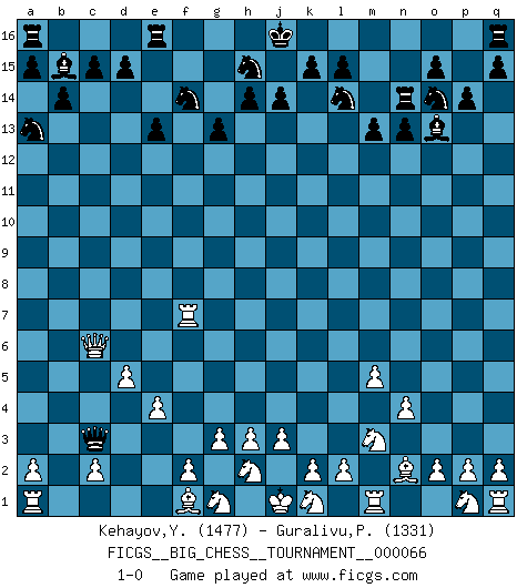 Last move : 1-0 2010 June 15 19:37:10 [Event "FICGS__BIG_CHESS__TOURNAMENT__000066"] [Site "FICGS"] [Date "2010.06.03"] [Round "1"] [White "Kehayov,Yulian"] [Black "Guralivu,Paul-Iosif"] [Result "1-0"] [WhiteElo "1477"] [BlackElo "1331"] 1.g2-g3 g15-g13 2.j2-k4 e15-e13 3.h1-o7 p16-o14 4.o7-f15 g16-f14 5.f15-c12 b16-c14 6.c12-l12 j15-l14 7.m2-m4 n15-n14 8.e2-e4 m15-m13 9.l12-l7 f16-d14 10.l7-l6 o16-m14 11.e1-e3 b15-b14 12.e3-f3 c16-b15 13.n2-n4 c14-a13 14.l6-p6 p15-p14 15.d2-d4 n14-n13 16.p6-o6 m14-n15 17.c1-p13 m16-m14 18.m4-m5 l16-o13 19.b1-c3 k16-m15 20.l1-o4 h16-m12 21.d4-d5 d14-c13 22.k4-m3 c13-h8 23.o4-h10 m14-n14 24.h10-n15 n14-n15 25.p13-o14 m15-o14 26.o1-n2 n15-n14 27.f3-f7 h8-c3 28.b2-c3 m12-c3 29.o6-c6 1-0 Follow this game move after move (download)He who takes the Queen's Knight's Pawn will sleep in the streets. (Anonymous) Ich könnte leicht behaupten: Ja,ja, Leonid Breschnew wollte nicht, daß ich Weltmeister werde. In der Tat war die Sache komplizierter. (Viktor Kortschnoi) La enorme capacidad mental, en la que sin ella no puede un jugador de Ajedrez existir, es demasiado requerida por el Ajedrez al grado de que nunca podrá liberar su mente de este juego. (Albert Einstein) Horreur, mais aussi harmonie suprême : qu'y avait-il en effet au monde en dehors des échecs ? Le brouillard, l'inconnu, le non-être... (Vladimir Nabokov) Lamb in skin of tiger, still fears the wolf. (Chinese proverb)