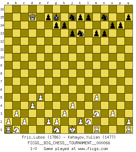 Last move : 1-0 2010 August 2 13:15:2 [Event "FICGS__BIG_CHESS__TOURNAMENT__000066"] [Site "FICGS"] [Date "2010.06.03"] [Round "1"] [White "Fric,Lubos"] [Black "Kehayov,Yulian"] [Result "1-0"] [WhiteElo "1786"] [BlackElo "1477"] 1.j2-k4 g15-g14 2.h1-o7 o15-o14 3.o7-l7 j15-k13 4.l7-c15 h16-o10 5.c15-f12 h15-f14 6.m2-m4 j16-h15 7.h2-g4 m15-m13 8.e2-e4 e15-e13 9.f12-c12 h15-g15 10.n2-n3 d15-d13 11.c12-c7 j14-j13 12.e1-e3 b16-c14 13.e3-b3 k16-h15 14.d2-d4 n15-n13 15.c1-f4 l16-o13 16.f1-d3 o10-o2 17.p1-o3 o13-j8 18.c7-q7 c16-h11 19.q7-q5 h11-e8 20.j3-j4 g16-j15 21.k1-j3 o16-e7 22.k4-m3 o2-o3 23.p2-o3 p16-n15 24.q5-p4 p15-p14 25.o1-p2 e8-g10 26.b3-b15 a16-b16 27.b15-c15 c14-d12 28.b2-b3 e16-e15 29.c15-c7 e7-j3 30.g4-j3 m16-m14 31.n3-n4 m14-l14 32.m4-m5 e15-e14 33.l1-n3 e14-c14 34.n3-d12 c14-c7 35.d12-e13 b16-e16 36.e13-f14 h15-f14 37.f4-c7 f14-g12 38.p4-g12 e16-e12 39.g12-d15 f16-c13 40.d15-d13 c13-b14 41.d13-a10 q16-e16 42.e4-e5 l14-l12 43.d3-j8 g10-j8 44.c7-a9 b14-d12 45.a9-d12 e12-d12 46.a10-a15 e16-d16 47.p2-q3 d12-d15 48.q3-d15 d16-d15 49.a15-d15 l12-l2 50.j3-l2 j8-m5 51.n4-m5 1-0 Follow this game move after move (download)Chess is a beautiful mistress. (Bent Larsen) Ein bischen Romantik kann weder im Schach noch in der Liebe schaden. Also versuche ich mich ab und zu daran zu erinnern. (Nigel Short) Alekhine es un poeta que crea un trabajo de arte de algo que raramente inspiraría a otra persona a mandar una tarjeta postal. (Max Euwe) Fischer est le meilleur joueur du monde et Karpov n'est qu'un joueur de bistrot. (Garry Kasparov, agé de 16 ans) Looking at the proliferation of personal web pages on the Net, it looks like very soon everyone on Earth will have 15 megabytes of fame. (M.G. Sriram)