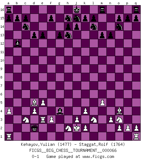 Last move : 0-1 2010 July 10 11:51:32 [Event "FICGS__BIG_CHESS__TOURNAMENT__000066"] [Site "FICGS"] [Date "2010.06.03"] [Round "1"] [White "Kehayov,Yulian"] [Black "Staggat,Rolf"] [Result "0-1"] [WhiteElo "1477"] [BlackElo "1764"] 1.g2-g3 g15-g13 2.j2-k4 h16-d12 3.m2-m4 p16-o14 4.h1-f3 g16-f14 5.p1-o3 m15-m13 6.m1-m3 n15-n13 7.e2-e4 e15-e13 8.e1-e3 d15-d13 9.d2-d4 l16-p12 10.f3-f6 k16-l14 11.f1-c4 f16-b12 12.l1-m2 o16-f8 13.e3-d3 c16-g12 14.c1-k8 b16-c14 15.l2-l3 e16-e14 16.b1-c3 f14-h13 17.m2-n3 e14-f14 18.n3-m2 f8-k4 19.l3-k4 f14-f6 20.h2-g4 f6-f8 21.m2-o4 d12-k6 22.g1-j2 f8-k8 23.k1-h2 k8-c8 24.c4-d5 c8-f8 25.m3-l3 f8-l8 26.l3-l8 g12-l8 27.n2-n3 k6-l6 28.o1-g8 l6-h3 29.f2-f3 l8-n6 30.j2-l3 h3-g3 31.m4-m5 n6-l8 32.g8-e6 g3-b8 33.e4-e5 b8-b2 34.j1-j2 b2-c2 35.d3-e3 c2-d2 36.a2-a4 l8-g4 37.e6-g4 p12-g4 0-1 Follow this game move after move (download)Chess is a part of culture and if a culture is declining then Chess too will decline. (Mikhail Botvinnik) Das Schachspiel hat wie die Liebe, die Musik, die Fähigkeit, den Menschen glücklich zu machen. Ich habe ein leises Gefühl des Bedauerns für jeden, der das Schachspiel nicht kennt, so wie ich jeden bedaure, der die Liebe nicht kennt. (Siegbert Tarrasch) Si un gobernante no entiende al Ajedrez, ¿como puede governar él un reinado?. (El Rey Khusros II) J'apprécie les joueurs d'est-indienne, c'est grâce à eux que je nourris ma famille depuis tant d'années. (Petrosian) No enterprise is more likely to succeed than one concealed from the enemy until it is ripe for execution. (Niccolo Machiavelli)