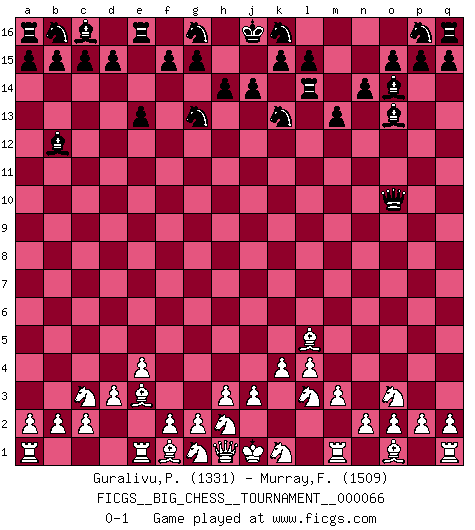 Last move : 0-1 2010 June 18 20:11:58 [Event "FICGS__BIG_CHESS__TOURNAMENT__000066"] [Site "FICGS"] [Date "2010.06.03"] [Round "1"] [White "Guralivu,Paul-Iosif"] [Black "Murray,Findlay"] [Result "0-1"] [WhiteElo "1331"] [BlackElo "1509"] 1.k2-k4 m15-m13 2.p1-o3 j15-k13 3.m2-m3 l16-o13 4.d2-d3 h15-g13 5.b1-c3 m16-m14 6.l1-n3 e15-e13 7.e2-e4 n15-n14 8.c1-o12 m14-l14 9.n3-l5 f16-b12 10.l2-l4 h16-o10 11.o12-e3 o16-n15 12.j2-l3 n15-o14 0-1 Follow this game move after move (download)One doesn't have to play well, it's enough to play better than your opponent. (Siegbert Tarrasch) Mein erstes Ziel war nicht, die Partie zu gewinnen, sondern eine Figur zu opfern. -- der junge (Wilhelm Steinitz) El juego del Ajedrez no es solamente una diversión quieta; algunas cualidades muy valuables de la mente se pueden adquirir y cultivar con el, como convertirlos en habitos disponibles para toda ocasión; ya que la vida es algo así como el Ajedrez. (Benjamin Franklin) Votre seul travail dans les ouvertures est d'obtenir un milieu de partie jouable. (Lajos Portish) There are two major products that came out of Berkeley: LSD and UNIX. We do not believe this is to be a coincidence. (Jeremy S. Anderson)