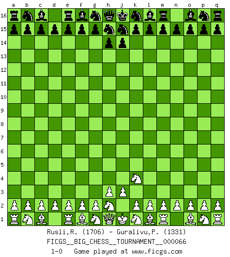 Last move : 1-0 2010 June 27 10:59:20 [Event "FICGS__BIG_CHESS__TOURNAMENT__000066"] [Site "FICGS"] [Date "2010.06.03"] [Round "1"] [White "Rusli,Rafnizar"] [Black "Guralivu,Paul-Iosif"] [Result "1-0"] [WhiteElo "1706"] [BlackElo "1331"] 1.j2-k4 1-0 Follow this game move after move (download)Place the contents of the Chess box in a hat, shake them up vigorously, pour them on the board from a height of two feet, and you get the style of Steinitz. (H. E. Bird) Sitze auf Deine Hände. (Siegbert Tarrasch) No hay precio que no valga la pena por la cabellera del Rey enemigo. (Koblentz) Toutes les manuvres exécutées sur une colonne ouverte ont pour but ultime l'intrusion définitive sur la septième ou la huitième rangée, en plein cur de la position ennemie. (Aaron Nimzovitch) At work, the authority of a person is inversely proportional to the number of pens that person is carrying. (Dan Rotaru)