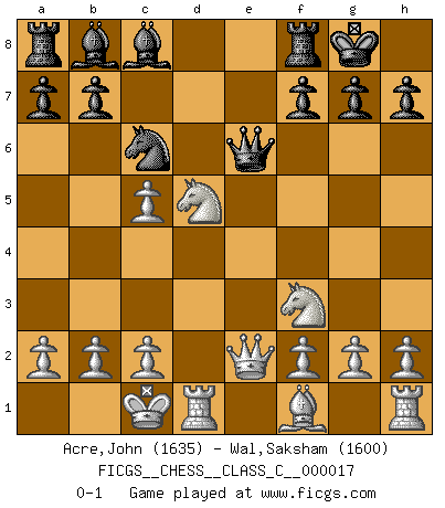 Last move : 0-1 2007 February 24 17:44:57 [Event "FICGS__CHESS__CLASS_C__000017"] [Site "FICGS"] [Date "2006.11.03"] [Round "1"] [White "Acre,John"] [Black "Wal,Saksham"] [Result "0-1"] [WhiteElo "1635"] [BlackElo "1600"] 1.e4 e6 2.d4 d5 3.Nc3 c5 4.exd5 exd5 5.Nf3 Nf6 6.Bg5 Nc6 7.Bxf6 Qxf6 8.Nxd5 Qe6+ 9.Qe2 Bd6 10.dxc5 Bb8 11.O-O-O O-O 0-1 French : Marshall variation Queenside Castling by player White (move 11) Kingside Castling by player Black (move 11) Player Black won this chess game. Follow this game move after move (download)Not all artists are Chess players, but all Chess players are artists. (Marcel Duchamp) Alles was ich jemals tun will ist Schach spielen. (Robert James Fischer) No existe un remordimiento como el remordimiento del Ajedrez. (H. G. Wells) J'ai vu le vaincu d'Echecs jouer des années durant dans l'espoir de la fête de la victoire. Car tu es plus riche de ce qu'elle existe si même elle n'est point pour toi. Ainsi de la perle du fond des mers. (Antoine de Saint-Exupéry) There are two major products that came out of Berkeley: LSD and UNIX. We do not believe this is to be a coincidence. (Jeremy S. Anderson)