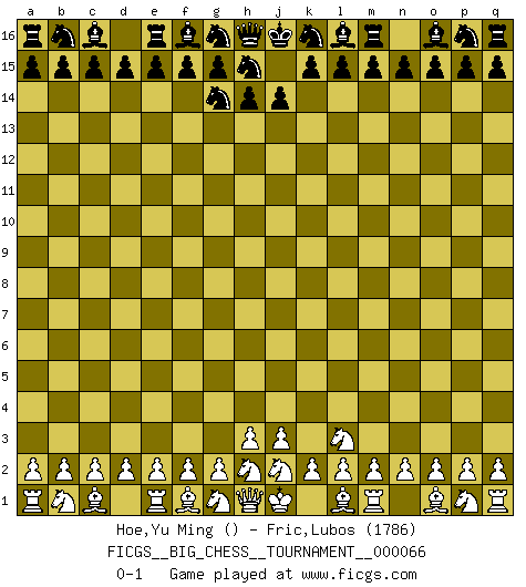 Last move : 0-1 2010 June 4 8:10:47 [Event "FICGS__BIG_CHESS__TOURNAMENT__000066"] [Site "FICGS"] [Date "2010.06.03"] [Round "1"] [White "Hoe,Yu Ming"] [Black "Fric,Lubos"] [Result "0-1"] [WhiteElo ""] [BlackElo "1786"] 1.k1-l3 j15-g14 0-1 Follow this game move after move (download)A win by an unsound combination, however showy, fills me with artistic horror. (Wilhelm Steinitz) Sehr viele beherrschen heutzutage das große Einmalseins des Schachspiels und kennen sogar dessen Logarithmentafeln auswendig - deshalb sollte man hin und wieder zu beweisen trachten, dass zwei mal zwei auch fünf sein kann. (Mikhail Nekhemyevich Tal) El Ajedrez es una manera fabulosa para que los niños aprendan a autovalorarse y a autoestimarse. (Saudin Robovic) Il vaut mieux sacrifier les pièces de l'adversaire. (Xavier Tartacover) Think like a man of action, act like a man of thought. (Henri Louis Bergson)