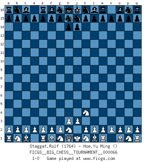 Last move : 1-0 2010 June 4 12:37:51 [Event "FICGS__BIG_CHESS__TOURNAMENT__000066"] [Site "FICGS"] [Date "2010.06.03"] [Round "1"] [White "Staggat,Rolf"] [Black "Hoe,Yu Ming"] [Result "1-0"] [WhiteElo "1764"] [BlackElo ""] 1.j2-k4 1-0 Follow this game move after move (download)First-class players lose to second-class players because second-class players sometimes play a first-class game. (Siegbert Tarrasch) Schach ist Krieg, im Schach geht es um testosterongesteuerte Urschreie. (Garry Kasparov) El jugador táctico debe saber que hacer cuando algo se debe de hacer. El estratégico debe saber que hacer cuando nada se debe de hacer. (Savielly Tartakover) Je ne suis pas le dernier à jouer lâchement des coups douteux pendant le zeïtnot de l'adversaire pour l'achever: en effet les coups qui font le plus peur sont ceux que l'on ne comprend pas. Je me fais souvent peur quand je joue. (Un professeur anonyme) Life is like a play: it's not the length but the excellence of the acting that matters. (Seneca)