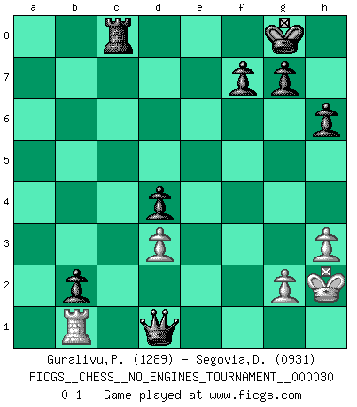 Last move : 0-1 2010 July 10 10:36:15 [Event "FICGS__CHESS__NO_ENGINES_TOURNAMENT__000030"] [Site "FICGS"] [Date "2010.06.04"] [Round "1"] [White "Guralivu,Paul-Iosif"] [Black "Segovia,Didier"] [Result "0-1"] [WhiteElo "1289"] [BlackElo "0931"] 1.e4 e5 2.Nf3 d6 3.Bc4 Bg4 4.Nc3 c6 5.O-O Nf6 6.d3 b5 7.Bb3 a5 8.a4 b4 9.Na2 Be7 10.c3 c5 11.Be3 O-O 12.h3 Bh5 13.cxb4 cxb4 14.Nc1 Nc6 15.Bd5 Rc8 16.Nb3 Nxd5 17.exd5 Nd4 18.Nbxd4 exd4 19.Rc1 Rxc1 20.Bxc1 Qb6 21.Qe2 Bf6 22.Qe4 Bxf3 23.Qxf3 Rc8 24.Qd1 Qc5 25.Re1 Qxd5 26.Qc2 Qb7 27.Qe2 Rf8 28.Bf4 Qc6 29.Rc1 Qxa4 30.Bxd6 Rd8 31.Bc7 Re8 32.Qd2 h6 33.Rc5 Qa1+ 34.Kh2 Bg5 35.Bf4 Bxf4+ 36.Qxf4 Qxb2 37.Rxa5 b3 38.Ra7 Rf8 39.Qe4 Qxf2 40.Ra1 b2 41.Rb1 Qc2 42.Qe1 Rc8 43.Qd1 Qxd1 0-1 Philidor's defense Kingside Castling by player White (move 5) Kingside Castling by player Black (move 11) Player Black won this chess game. Follow this game move after move (download)The passed pawn is a criminal, who should be kept under lock and key. Mild measures, such as police surveillance, are not sufficient. (Nimzovitch) Ich glaube, ich kenne inzwischen die Gründe für mein Versagen: schachliche Charakterfehler. Ich war nie ein Wunderkind und in meiner gesamten menschlichen Entwicklung immer zu langsam. (Viktor Kortschnoi) El Ajedrez es una guerra en un tablero. El objetivo es aplastar la mente del oponente. (Bobby Fischer) Mon pion favori sur ma case favorite ! Bronstein en parlant d'un coup de pion en h5 quand il avait les Noirs. The Internet is so big, so powerful and pointless that for some people it is a complete substitute for life. (Andrew Brown)
