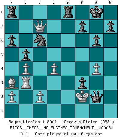 Last move : 0-1 2010 July 4 2:29:20 [Event "FICGS__CHESS__NO_ENGINES_TOURNAMENT__000030"] [Site "FICGS"] [Date "2010.06.04"] [Round "1"] [White "Reyes,Nicolas"] [Black "Segovia,Didier"] [Result "0-1"] [WhiteElo "1800"] [BlackElo "0931"] 1.d4 d5 2.Nf3 Nc6 3.e3 Bg4 4.Be2 Nf6 5.O-O g6 6.Nc3 Bg7 7.b3 O-O 8.h3 Bxf3 9.Bxf3 e6 10.Ba3 Re8 11.b4 a6 12.Qd3 b5 13.Rab1 e5 14.g4 e4 15.Qe2 exf3 16.Qxf3 Ne4 17.Nxe4 dxe4 18.Qf4 Qd6 19.Qg5 Ne7 20.f3 Qg3+ 21.Kh1 Qxh3+ 22.Kg1 Bh6 23.Qe5 Bxe3+ 24.Rf2 Nc6 25.Qxc7 exf3 26.Rb3 Bxf2+ 27.Kxf2 Qg2+ 0-1 Queen's pawn game, Chigorin variation Kingside Castling by player White (move 5) Kingside Castling by player Black (move 7) Player Black won this chess game. Follow this game move after move (download)It is not a move, even the best move that you must seek, but a realizable plan. (Eugene Znosko-Borovsky) Herr Iljumschinow ist ein etwas merkwürdiger Geschäftsmann: Er arbeitet zusammen mit Leuten wie Muammar al-Gaddafi; früher ist das Saddam Hussein gewesen. (Joel Lautier) Botvinnik trató de alejar el misterio referente al Ajedrez, siempre relacionandolo a situaciones de la vida diaria. Solía llamar al Ajedrez un problema inexacto típico, similar a aquellos en que la gente tiene siempre que resolver a cada día. (Garry Kasparov) Avant la finale, les dieux ont créé le milieu de partie. (Tarrasch) Everything in life is luck. (Donald Trump)