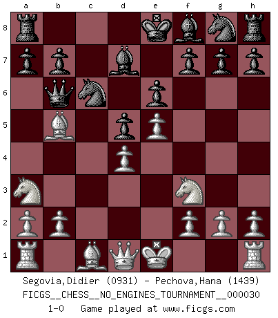 Last move : 1-0 2010 July 16 21:28:44 [Event "FICGS__CHESS__NO_ENGINES_TOURNAMENT__000030"] [Site "FICGS"] [Date "2010.06.04"] [Round "1"] [White "Segovia,Didier"] [Black "Pechova,Hana"] [Result "1-0"] [WhiteElo "0931"] [BlackElo "1439"] 1.e4 e6 2.d4 d5 3.e5 c5 4.c3 Nc6 5.Nf3 Qb6 6.Na3 cxd4 7.cxd4 Bd7 8.Bb5 1-0 This chess game has been lost on time (started : 2010.06.04 10:46:58) French : Advance, Paulsen attack Player White won this chess game. Follow this game move after move (download)Adequate compensation for a sacrifice is having a sound combination leading to a winning position; adequate compensation for a blunder is having your opponent snatch defeat from the jaws of victory. (Bruce A. Moon) Die Arbeit ist etwas Unnatürliches. Die Faulheit allein ist göttlich. (Anatole France) No hay precio que no valga la pena por la cabellera del Rey enemigo. (Koblentz) Dieu déplace le joueur, et celui-ci la pièce. Quel Dieu derrière Dieu commence donc la trame ? Arturo Perez-Reverte (prix de littérature policière 1993). There is no instance of a country having benefited from prolonged warfare. (Sun Tzu)