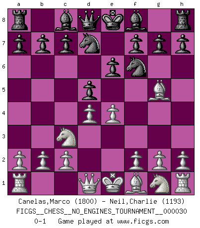 Last move : 0-1 2010 August 9 10:18:44 [Event "FICGS__CHESS__NO_ENGINES_TOURNAMENT__000030"] [Site "FICGS"] [Date "2010.06.04"] [Round "1"] [White "Canelas,Marco"] [Black "Neil,Charlie"] [Result "0-1"] [WhiteElo "1800"] [BlackElo "1193"] 1.d4 e6 2.e4 d5 3.Nc3 Nf6 4.Bg5 Nbd7 0-1 Queen's pawn Player Black won this chess game. Follow this game move after move (download)Botvinnik tried to take the mystery out of Chess, always relating it to situations in ordinary life. He used to call Chess a typical inexact problem similar to those which people are always having to solve in everyday life. (Garry Kasparov) Über Karpov: Er war und ist ein Vertreter der russischen Reaktionäre. Das steckt tief in seiner Seele, wehalb ich nicht nett mit ihm umgehen kann. (Viktor Kortschnoi) ¿Se han dado cuenta de que Fischer casi nunca ha tenido piezas malas? El las intercambia y las piezas malas se quedan con sus oponenets. (Yuri Balashov) Le pion, dans sa simplicité, marche droit devant lui, mais lorsqu'il prend, il le fait obliquement? Ainsi l'homme, tant qu'il reste pauvre, marche dans la droiture et vit honnêtement, mais lorsqu'il recherche les honneurs, il flatte, se parjure et, par les voies obliques, cherche une position supérieure sur l'échiquier du monde. (Jean de Galles) Art is not a thing, it is a way. (Elbert Hubbard)