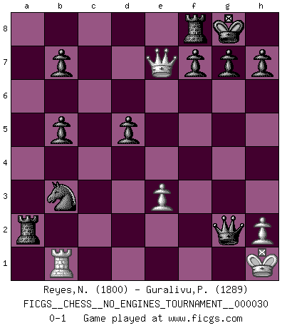 Last move : 0-1 2010 June 28 22:51:32 [Event "FICGS__CHESS__NO_ENGINES_TOURNAMENT__000030"] [Site "FICGS"] [Date "2010.06.04"] [Round "1"] [White "Reyes,Nicolas"] [Black "Guralivu,Paul-Iosif"] [Result "0-1"] [WhiteElo "1800"] [BlackElo "1289"] 1.d4 Nf6 2.Nc3 e6 3.Bf4 d5 4.e3 a6 5.Nf3 c5 6.dxc5 Bxc5 7.Bd3 O-O 8.O-O Nbd7 9.Re1 e5 10.Bg5 e4 11.Bxf6 Nxf6 12.Na4 Bb6 13.Ne5 exd3 14.Qxd3 Bd7 15.b4 Bxa4 16.b5 Bxb5 17.Qf5 Qc8 18.Qg5 Bc7 19.a4 Bxe5 20.axb5 Bxa1 21.Rxa1 axb5 22.Rc1 Ra2 23.c4 Qxc4 24.Rf1 Ne4 25.Qe7 Nd2 26.Re1 Qe2 27.Rc1 Nb3 28.Rb1 Qxf2+ 29.Kh1 Qxg2+ 0-1 Queen's pawn game Kingside Castling by player Black (move 7) Kingside Castling by player White (move 8) Player Black won this chess game. Follow this game move after move (download)The boy (then a 12 year old boy named Anatoly Karpov) doesn't have a clue about Chess, and there's no future at all for him in this profession. (Mikhail Botvinnik) Unter Putin wird alles Geld aus Russland wie von einem Staubsauger nach Moskau umgeleitet, das ist wie ein schwarzes Loch. (Garry Kasparov) ¿Quién es tu oponente esta tarde? Esta tarde mi oponente son las piezas negras. (Akiba Rubinstein) Toutes choses étant égales, c'est la conviction qui gagne. Alliée à une volonté de vaincre, elle sert de détonateur, suscite des idées, disperse les doutes et aide à penser clairement. (Robert Fischer) I find television to be very educating. Every time somebody turns on the set, I go in the other room and read a book. (Groucho Marx)