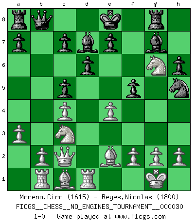 Last move : 1-0 2010 September 11 20:41:23 [Event "FICGS__CHESS__NO_ENGINES_TOURNAMENT__000030"] [Site "FICGS"] [Date "2010.06.04"] [Round "1"] [White "Moreno,Ciro"] [Black "Reyes,Nicolas"] [Result "1-0"] [WhiteElo "1615"] [BlackElo "1800"] 1.c4 d6 2.d4 Nc6 3.d5 Bf5 4.dxc6 bxc6 5.Nc3 g6 6.e4 Be6 7.Nf3 Qb8 8.Qa4 Bd7 9.Be2 c5 10.Qc2 Bg7 11.O-O Nf6 12.Rd1 h6 13.Rb1 Nh5 14.a3 f5 15.Nh4 Rg8 16.Nxg6 1-0 English Opening Kingside Castling by player White (move 11) Player White won this chess game. Follow this game move after move (download)Chess, like love, is infectious at any age. (Flohr) Den Ruhm habe ich schon, jetzt brauche ich noch das Geld. (Wilhelm Steinitz) Hasta este punto, las blancas han seguido un análisis bien conocido. Pero ahora el hace un error fatal: empieza a usar su propia cabeza. (Siegbert Tarrasch) On croit qu'il y a plus de mauvais joueurs que de bons joueurs, c'est faux : Il y a autant de joueurs qui gagnent que de joueurs qui perdent. (Philippe Geluck) Opportunities multiply as they are seized. (Sun Tzu)