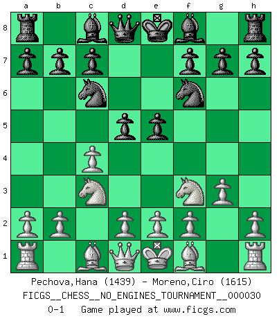 Last move : 0-1 2010 July 24 12:6:26 [Event "FICGS__CHESS__NO_ENGINES_TOURNAMENT__000030"] [Site "FICGS"] [Date "2010.06.04"] [Round "1"] [White "Pechova,Hana"] [Black "Moreno,Ciro"] [Result "0-1"] [WhiteElo "1439"] [BlackElo "1615"] 1.c4 e5 2.Nc3 Nc6 3.Nf3 Nf6 4.g3 d5 0-1 English : Four knights, kingside Fianchetto Player Black won this chess game. Follow this game move after move (download)Chess is everything: art, science and sport. (Anatoly Karpov) Ich spiele ehrlich und spiele, um zu gewinnen. Wenn ich verliere nehme ich meine Medizin. (Robert James Fischer) Un Peón pasado es un criminal, quién debe ser mantenido bajo candado y llave. Leves medidas, tales como vigilancia policiaca, no son suficientes. (Aaron Nimzovich) Nous sommes les pions de la mystérieuse partie d'Echecs jouée par Dieu. Il nous déplace, nous arrête, nous pousse encore, puis nous lance un à un dans la boîte du Néant. Epitaphe sur la tombe de David Janowsky (1868-1927). Without deviation from the norm, progress is not possible. (Frank Zappa)
