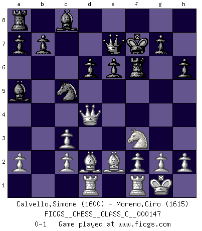 Last move : 0-1 2010 December 21 22:25:28 [Event "FICGS__CHESS__CLASS_C__000147"] [Site "FICGS"] [Date "2010.06.04"] [Round "1"] [White "Calvello,Simone"] [Black "Moreno,Ciro"] [Result "0-1"] [WhiteElo "1600"] [BlackElo "1615"] 1.e4 c5 2.Nf3 e6 3.d4 cxd4 4.Nxd4 Nf6 5.Nc3 Bb4 6.e5 Nd5 7.Bd2 Nxc3 8.bxc3 Ba5 9.Qg4 O-O 10.Bd3 d6 11.Nf3 f5 12.exf6 Rxf6 13.O-O h6 14.Qe4 Kf7 15.Rad1 Nd7 16.Be2 Nc5 17.Qd4 Qe7 0-1 This chess game has been lost on time (started : 2010.06.04 19:42:14) Sicilian : Pin, Koch variation Kingside Castling by player Black (move 9) Kingside Castling by player White (move 13) Player Black won this chess game. Follow this game move after move (download)War is the child of passion, passion is the child of narcissism and narcissism is the child. (...) Another game ? (Thibault de Vassal) Ich habe die besten Aussichten, den ersten Preis zu gewinnen - denn jeder muss gegen Steinitz spielen, nur ich nicht! (Wilhelm Steinitz) Bendita sea la memoria de aquel que dio al mundo este juego inmortal. (A. G. Gardiner) L'attaque fait le spectacle, la défense gagne les matchs. (Dicton footballistique) Hold em is to stud what chess is to checkers. (Johnny Moss)