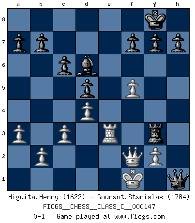 Last move : 0-1 2010 October 4 15:47:14 [Event "FICGS__CHESS__CLASS_C__000147"] [Site "FICGS"] [Date "2010.06.04"] [Round "1"] [White "Higuita,Henry"] [Black "Gounant,Stanislas"] [Result "0-1"] [WhiteElo "1622"] [BlackElo "1784"] 1.e4 e6 2.Nf3 d5 3.exd5 exd5 4.h3 Bd6 5.d4 Ne7 6.a3 Bf5 7.Nc3 c6 8.Bd3 O-O 9.O-O Bxd3 10.Qxd3 Ng6 11.Be3 Nd7 12.Ne2 Re8 13.c3 Nh4 14.Nxh4 Qxh4 15.f4 Nf6 16.Bf2 Qh6 17.Bg3 Re6 18.Rf3 Rae8 19.Re1 Nh5 20.f5 Re3 21.Rxe3 Rxe3 22.Qd2 Nxg3 23.Nxg3 Rxg3 24.Qf2 Qxh3 25.Kf1 Qh4 26.Re3 Qh1+ 0-1 French defense Kingside Castling by player Black (move 8) Kingside Castling by player White (move 9) Player Black won this chess game. Follow this game move after move (download)A man without frontiers. He didn't divide the East and the West, he brought them together in their admiration for him. (Ljubomir Ljubojevic, about Bobby Fischer's death) In Buenos Aires ist es nicht mein vorrangiges Ziel ein starkes Turnier zu organisieren, sondern ein Turnier für Gentlemen. Ich würde nie Kamsky einladen. Ich mag keine Probleme. (Miguel Najdorf) Una victoria por una combinación errónea, aunque sea espectacular, me llena de horror artístico. (Wilhelm Steinitz) La tactique, c'est ce que vous faites quand il y a quelque chose à faire; la stratégie, c'est ce que vous faites quand il n'y a rien à faire. (Savielli Tartacower) Every now and then a man's mind is stretched by a new idea and never shrinks back to its former dimensions. (Oliver Wendell Holmes, Sr.)
