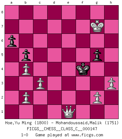 Last move : 1-0 2011 February 18 22:42:33 [Event "FICGS__CHESS__CLASS_C__000147"] [Site "FICGS"] [Date "2010.06.04"] [Round "1"] [White "Hoe,Yu Ming"] [Black "Mohandoussaid,Malik"] [Result "1-0"] [WhiteElo "1800"] [BlackElo "1751"] 1.e4 d6 2.d4 Nd7 3.Nf3 c6 4.Bd3 e5 5.O-O Be7 6.Re1 Ngf6 7.Nbd2 O-O 8.c3 Qc7 9.h3 Re8 10.Nf1 Nf8 11.Ng3 Ng6 12.Qc2 Bf8 13.Bg5 Nd7 14.Rad1 h6 15.Be3 Qd8 16.Bc4 Nf6 17.dxe5 Nxe5 18.Nxe5 Rxe5 19.Bf4 Re8 20.Bxd6 Qb6 21.e5 Nd5 22.Bxf8 Rxf8 23.Bxd5 cxd5 24.Rxd5 Be6 25.Rd6 Qa5 26.a3 Rac8 27.Qe4 Qb5 28.Qb4 Qxb4 29.axb4 a6 30.Ne4 Rfd8 31.Nc5 Rxd6 32.exd6 Rb8 33.Nxe6 fxe6 34.Rxe6 Kf8 35.f4 Rd8 36.Kf2 Rd7 37.Kf3 Kf7 38.f5 b5 39.Kf4 g5+ 40.Kg4 Kg7 41.Re7+ Rxe7 42.dxe7 Kf7 43.f6 Ke8 44.Kh5 Kf7 45.Kxh6 Kxf6 46.e8Q Kf5 47.Kg7 Kf4 48.Qe1 1-0 This chess game has been lost on time (started : 2010.06.04 19:42:14) King's pawn Opening Kingside Castling by player White (move 5) Kingside Castling by player Black (move 7) Promotion Queen by player White (move 46) Player White won this chess game. Follow this game move after move (download)Fischer is under obligation to nobody. (Joseph Platz) Man gibt nur Pakete auf. (Paul Keres) Nunca nadie ha ganado una partida de Ajedrez rindiendose. (Unknown) Nous vivons dans un monde échiquéen : chaque jour qui passe est un défi à relever. (Philosophe Sasha) Creativity is allowing yourself to make mistakes. Art is knowing which ones to keep. (Scott Adams)