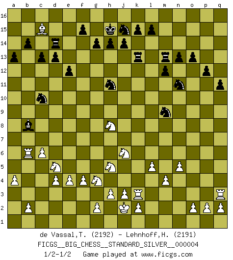 Last move : 1/2-1/2 2011 January 5 13:51:55 [Event "FICGS__BIG_CHESS__STANDARD_SILVER__000004"] [Site "FICGS"] [Date "2010.06.06"] [Round "1"] [White "de Vassal,Thibault"] [Black "Lehnhoff,Heinz-Georg"] [Result "1/2-1/2"] [WhiteElo "2192"] [BlackElo "2191"] 1.j2-k4 g15-g14 2.h1-o7 h16-c11 3.b1-c3 m15-m13 4.m2-m4 e15-e13 5.h2-g4 j15-k13 6.p1-o3 p16-q14 7.e2-e4 n15-n13 8.g1-f3 o15-o14 9.f1-b5 g16-j15 10.k1-l3 l16-p12 11.f3-e5 d15-d13 12.d2-d4 c16-l8 13.o7-d7 c15-c14 14.c1-h6 c11-d12 15.d7-b9 b15-b14 16.a1-d1 b16-d15 17.a2-a4 o16-j11 18.n2-n4 m13-m12 19.l1-o4 f16-a11 20.o1-f9 h15-j13 21.c3-d5 k16-h15 22.c2-c4 h15-g13 23.b9-b11 d12-b10 24.b11-j4 b10-j10 25.j4-j10 l8-j10 26.o3-n5 k13-l11 27.n5-l6 e13-e12 28.m1-m3 q14-o13 29.f9-j6 p12-j6 30.k4-j6 d15-e13 31.j1-j2 j16-h15 32.l3-k5 e13-f11 33.l2-l4 m16-m13 34.f2-f4 o13-n11 35.o4-m6 a11-d8 36.e5-g6 j13-k11 37.g6-h8 j10-h11 38.b5-h11 g13-h11 39.m6-o8 l11-m9 40.o8-m6 m13-l13 41.k5-j7 q15-q13 42.c4-c5 p15-p14 43.m3-p3 p14-p13 44.l4-l5 j11-h10 45.m6-h10 k11-h10 46.p3-p8 d8-b10 47.e1-e3 b10-d12 48.e3-b3 e16-e13 49.q1-n1 e13-g13 50.b3-g3 a16-e16 51.d1-d3 h10-g8 52.h6-g5 g8-j7 53.l6-j7 p13-p12 54.n1-n3 o14-o13 55.d3-b3 q13-q12 56.b3-b7 l13-k13 57.p8-p3 q16-m16 58.n3-k3 m16-m13 59.g3-b3 e16-e14 60.g5-b10 d12-c13 61.j7-h5 c13-d14 62.p3-q3 q12-q11 63.n4-n5 d14-f12 64.b3-b6 c14-c13 65.b10-e7 f11-e9 66.b6-a6 a15-a13 67.e7-j11 g13-g8 68.j11-d16 g8-b8 69.b7-b8 f12-b8 70.a6-b6 e9-c10 71.c5-c6 e14-d14 72.d16-c15 d14-c14 73.c15-d16 c14-d14 74.d16-c15 1/2-1/2 Follow this game move after move (download)I love all positions. Give me a difficult positional game, I will play it. But totally won positions, I cannot stand them. (Hein Donner) Es ist schade, dass viele Schachsportler vergessen, wie wichtig Auftreten und angemessene Kleidung sind. (Alexandra Kosteniuk) Al jugar al Ajedrez entonces, podemos aprender: Primero: Previsión... Segundo: Prudencia... Tercero: Cautela... Y al final, aprendemos del Ajedrez el hábito de no ser desanimados por apariencias malas presentes en el estado de nuestros asuntos, el hábito de la esperanza por una oportunidad favorable y la perseveración de los secretos de los recursos. (Benjamin Franklin) Dans le domaine de la peinture, de la gravure et de la sculpture, dès la première décennie de notre siècle, les artistes abandonnent la représentation de la partie d'échecs pour se concentrer sur les pièces, sur les échiquiers et sur toutes les variations auxquelles les unes et les autres peuvent donner lieu. On passe en quelque sorte d'un thème social à un thème musical (au sens de la musica médiévale, c'est-à-dire d'une notion qui inclue le rythme, l'harmonie, la construction et la déconstruction, etc.). Graphiquement et picturalement, l'échiquier apparaît comme une structure ouverte, dynamique, d'une richesse infinie, autorisant toutes les combinatoires et débouchant sur des mouvements et des rythmes de nature exponentielle. (Michel Pastoureau) The question of whether computers can think is just like question of whether submarines can swim. (Edsger W. Dijkstra)