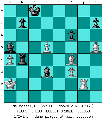 Last move : 1/2-1/2 2010 June 6 17:11:54 [Event "FICGS__CHESS__BULLET_BRONZE__000358"] [Site "FICGS"] [Date "2010.06.06"] [Round "1"] [White "de Vassal,Thibault"] [Black "Nookala,Kamesh"] [Result "1/2-1/2"] [WhiteElo "2297"] [BlackElo "2351"] 1.d4 d5 2.Nf3 Nf6 3.c4 c6 4.e3 e6 5.Nc3 Nbd7 6.Qc2 Bd6 7.g4 Nxg4 8.Rg1 Qf6 9.Rxg4 Qxf3 10.Rxg7 Nf6 11.Rg5 Qh1 12.Rg2 Bxh2 13.Qe2 Bd6 14.e4 dxe4 15.Nxe4 Nxe4 16.Qxe4 Qh5 17.Be2 Qf5 18.Qxf5 exf5 19.Bh6 Be6 20.Kd2 O-O-O 21.Kc3 a5 22.a3 Be7 23.Rd1 Bf6 24.b4 Rhg8 25.Rxg8 Rxg8 26.Bf3 axb4+ 27.Kxb4 Be7+ 28.Kc3 Bd6 29.a4 Bc7 30.Rh1 f6 31.Be3 f4 32.Bc1 Ba5+ 33.Kd3 Re8 34.Rh5 Be1 35.d5 Bf7 36.Rh2 Bg6+ 37.Kd4 cxd5 38.cxd5 Ba5 39.Bxf4 Bb6+ 40.Kc3 Re1 41.Bh5 Ba5+ 42.Kb2 Rb1+ 43.Ka2 Be4 44.f3 Bd3 45.Rg2 Rb4 1/2-1/2 Queen's pawn game Queenside Castling by player Black (move 20) This chess game ended in a draw. Follow this game move after move (download)I thought the most common mistake [in chess] was the first one: Learning the game :P (Garvin Gray, FICGS forum) Ja, ich habe einmal eine Blitzpartie gespielt, es war in einem Zug, 1929. --im Interview 1989 (Mikhail Moiseyevich Botvinik) Yo no creo en la psicología. Yo creo en las buenas movidas. (Bobby Fischer) Les échecs, c'est l'art d'analyser. (Mikhail Botvinnik) See no evil, hear no evil, speak no evil. (The 3 monkeys)