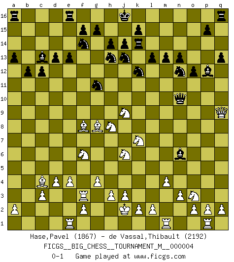 Last move : 0-1 2010 August 21 23:22:39 [Event "FICGS__BIG_CHESS__TOURNAMENT_M__000004"] [Site "FICGS"] [Date "2010.06.06"] [Round "1"] [White "Hase,Pavel"] [Black "de Vassal,Thibault"] [Result "0-1"] [WhiteElo "1867"] [BlackElo "2192"] 1.p1-o3 m15-m13 2.b1-c3 e15-e13 3.g1-f3 j15-h13 4.n2-n3 d15-d13 5.m2-m4 c15-c13 6.d2-d4 g16-f14 7.e2-e4 n15-n13 8.f1-c4 o15-o13 9.l1-m2 o16-j11 10.c1-h6 h15-j13 11.o1-g8 p16-o14 12.j2-k4 h16-p9 13.q1-p1 b16-c14 14.k1-l3 c13-c12 15.h1-l4 l15-l13 16.l3-j4 k16-l14 17.j4-l5 f16-c13 18.k4-j6 o13-o12 19.f3-h4 l16-p12 20.m2-k4 a15-a13 21.h2-j4 q15-q13 22.e1-e3 b15-b13 23.e3-f3 c16-h11 24.g2-g4 b13-b12 25.h4-g6 c14-e15 26.a1-e1 e15-f13 27.g6-h8 f13-g11 28.j4-g5 o14-n12 29.c3-d5 p9-a9 30.j1-j2 a9-b8 31.d5-f6 b8-b2 32.c2-c3 l14-k12 33.h6-f8 j11-f8 34.k4-f8 b2-b10 35.g5-h7 m16-m14 36.l4-q9 m14-k14 37.l5-k7 b10-n10 38.h7-j9 h11-n6 0-1 Follow this game move after move (download)By this measure (on the gap between Fischer & his contemporaries), I consider him the greatest world champion. (Garry Kasparov) Das Schachspiel ist ein See, in welchem eine Mücke baden und ein Elefant ertrinken kann. (Emanuel Lasker) El Ajedrez es un juego terrible. Si no dominas el centro, tu oponente tiene una posición mas libre. Si tu tienes el centro, entonces realmente tienes algo de que preocuparte. (Siegbert Tarrasch) À la honte des hommes, on sait que les lois du jeu sont les seules qui soient partout justes, claires, inviolables et exécutées. Pourquoi l'Indien qui a donné les règles du jeu d'échecs est-il obéi de bon gré dans toute la terre, et que les décrétales des papes, par exemple, sont aujourd'hui un objet d'horreur et de mépris ? C'est que l'inventeur des échecs combina tout avec justesse pour la satisfaction des joueurs, et que les papes, dans leurs décrétales, n'eurent en vue que leur seul avantage. L'Indien voulut exercer également l'esprit des hommes et leur donner du plaisir; les papes ont voulu abrutir l'esprit des hommes. Voltaire (Dictionnaire philosophique / Garnier 1967) Animated gif is worth one mega-word. (Unknown)