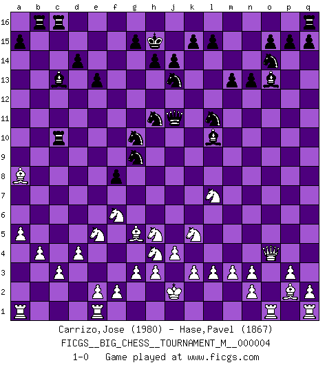 Last move : 1-0 2010 September 11 6:39:57 [Event "FICGS__BIG_CHESS__TOURNAMENT_M__000004"] [Site "FICGS"] [Date "2010.06.06"] [Round "1"] [White "Carrizo,Jose"] [Black "Hase,Pavel"] [Result "1-0"] [WhiteElo "1980"] [BlackElo "1867"] 1.j2-k4 p16-o14 2.h1-o7 h15-g13 3.o7-c7 j15-k13 4.c7-c15 b16-c14 5.c15-o4 e15-e13 6.c2-c3 n15-n13 7.d2-d4 f16-c13 8.m2-m3 o16-g9 9.l1-n3 g9-n3 10.o2-n3 d15-d14 11.p2-p3 m15-m14 12.o1-p2 c16-k9 13.b1-d2 l16-o13 14.d2-f3 g16-f14 15.f3-e5 k16-h15 16.p1-o3 h16-q8 17.o3-m4 f14-h13 18.l2-l3 m14-m13 19.g1-j2 h15-j13 20.h2-g4 g13-h11 21.k1-h2 c14-d12 22.p2-b15 a16-b16 23.b15-p2 b16-b10 24.m1-o1 e16-b16 25.b2-b4 f15-f13 26.a2-a4 d12-e10 27.a4-a5 h13-j11 28.c1-d2 j16-h15 29.g2-g3 m16-c16 30.f1-g2 q8-e8 31.j3-j4 f13-f12 32.k2-k3 f12-f11 33.j2-h4 f11-f10 34.j1-j2 f10-f9 35.h2-f3 f9-f8 36.g4-f6 e8-e6 37.k4-h5 e10-g9 38.f3-g5 e6-j10 39.g5-j6 j11-g10 40.g2-d5 j10-j11 41.j6-l7 k9-l10 42.m4-k5 k13-l11 43.d2-g5 b10-c10 44.d5-a8 1-0 Follow this game move after move (download)When the Chess game is over, the Pawn and the King go back to the same box. (Irish saying) Garry Kasparov war erst in der Großmeister-Organisation GMA, dann in der Profischach-Vereinigung PCA, zum Schluss kehrte er wieder in den Schoß der FIDE zurück. Aber gut, manche Leute sind flexibel (Viswanathan Anand) Por esta medida (el intervalo entre Fischer y sus contemporaneos), yo le considero el mas grande campeón mundial. (Garry Kasparov) Les Echecs ne sont pas pour les âmes timides. Ils requièrent un homme entier, qui ne s'arrête pas aveuglément à ce qui a été déjà établi, mais qui tente individuellement de sonder les profondeurs du jeu. (W. Steinitz) You can only get smarter by playing a smarter opponent. (Revolver, movie)