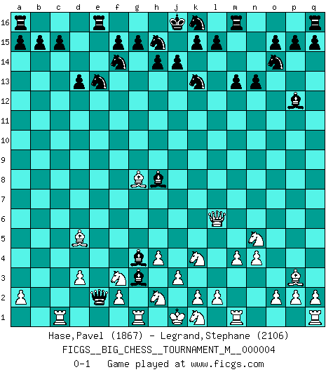 Last move : 0-1 2010 July 25 0:56:2 [Event "FICGS__BIG_CHESS__TOURNAMENT_M__000004"] [Site "FICGS"] [Date "2010.06.06"] [Round "1"] [White "Hase,Pavel"] [Black "Legrand,Stephane"] [Result "0-1"] [WhiteElo "1867"] [BlackElo "2106"] 1.p1-o3 m15-m13 2.b1-c3 p16-o14 3.d2-d3 j15-k13 4.m2-m4 e15-e13 5.n2-n4 d15-d13 6.g2-g4 g16-f14 7.c1-k8 b16-c14 8.l1-o4 n15-n13 9.f1-g2 f16-c13 10.g2-d5 l16-o13 11.o1-g8 h16-p9 12.o4-p3 p9-n9 13.j2-k4 c13-h8 14.h3-h4 o16-d6 15.g1-f3 c16-l8 16.h1-g2 o13-p12 17.g2-l6 d6-a9 18.k8-l7 n9-b9 19.l7-e13 c14-e13 20.o3-n5 l8-g4 21.e1-g1 b9-b2 22.c3-e4 b2-c2 23.a1-c1 c2-e2 24.e4-g3 a9-g3 0-1 Follow this game move after move (download)Later, I began to succeed in decisive games. Perhaps because I realized a very simple truth: not only was I worried, but also my opponent. (Mikhail Tal) Stil? Ich habe keinen Stil! (Anatoly Karpov) Una mala movida nulifica cuarenta buenas. (Horowitz) Karpov est une pièce de musée. (Garry Kasparov) For a mechanic, you seem to do an excessive amount of thinking. (C-3PO in Star Wars ep.2)