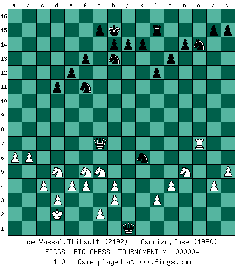Last move : 1-0 2011 May 20 6:27:33 [Event "FICGS__BIG_CHESS__TOURNAMENT_M__000004"] [Site "FICGS"] [Date "2010.06.06"] [Round "1"] [White "de Vassal,Thibault"] [Black "Carrizo,Jose"] [Result "1-0"] [WhiteElo "2192"] [BlackElo "1980"] 1.j2-k4 j15-k13 2.h1-o7 h15-g13 3.o7-o15 p16-o14 4.o15-h9 h16-o10 5.h2-g4 o10-o2 6.m2-m4 o2-o7 7.b1-c3 c15-c14 8.p1-o3 d15-d13 9.k1-l3 b16-d15 10.n2-n4 d15-f14 11.o3-n5 o7-p7 12.p2-p4 c16-f13 13.h9-q9 k16-l14 14.l1-q6 p7-e7 15.o1-j6 e15-e14 16.q1-o1 f16-b12 17.g1-j2 k15-k14 18.q9-q12 a15-a13 19.o1-o7 e7-d8 20.d2-d3 n15-n14 21.e2-e4 l16-k15 22.m1-o1 l14-j13 23.f1-e2 o16-n15 24.c3-d5 k15-m13 25.c2-c4 g16-j15 26.q2-q3 j16-h15 27.n5-l6 f13-e12 28.c1-f4 a13-a12 29.b2-b4 a12-a11 30.j1-h2 a11-a10 31.l3-j4 a10-a9 32.f4-g5 d8-d9 33.o7-o9 d9-d12 34.g4-j5 e14-e13 35.e2-h5 a9-a8 36.a2-a4 a8-a7 37.a4-a5 b15-b13 38.j2-g3 j15-l14 39.e1-e3 a16-a8 40.j5-g6 e16-a16 41.q6-n9 l14-k12 42.n9-k6 d12-d7 43.o1-o7 d7-a10 44.e3-f3 m13-k11 45.o7-p7 q16-p16 46.q12-l7 a16-e16 47.j6-m9 k11-m9 48.o9-m9 l15-l13 49.g5-e3 a7-a6 50.m9-c9 d13-d12 51.c9-c6 k12-h13 52.a1-o1 l13-l12 53.f3-f6 e12-f11 54.g6-e7 d12-d11 55.o1-o6 n15-l13 56.p7-p6 l13-j11 57.o6-o10 a10-a11 58.k6-h4 a11-a9 59.h5-g4 a9-d12 60.d5-c7 a8-a9 61.c7-a6 j11-k12 62.l7-q7 b12-a11 63.f6-e6 f11-h9 64.e6-h6 h9-j8 65.e7-d5 a11-h4 66.j3-h4 j8-m11 67.q7-k7 c14-c13 68.e3-g5 a9-q9 69.o10-o3 c13-c12 70.j4-l5 e13-e12 71.k2-k3 g13-f11 72.k4-m5 f14-g12 73.l6-j5 f15-f13 74.g4-f5 m11-f5 75.g3-f5 e16-a16 76.h6-m6 a16-a9 77.g5-m10 k12-m10 78.m6-m10 q9-p9 79.m10-p10 p9-p10 80.p6-p10 k13-m14 81.k7-p7 m14-o13 82.a6-c7 m15-m13 83.c6-n6 o14-n12 84.m5-n7 d12-j7 85.f2-f4 j7-k8 86.n7-l6 k8-q2 87.o3-l3 q2-m2 88.l5-j4 a9-o9 89.n6-o6 o9-o6 90.p7-o6 m16-o16 91.p10-p8 o16-o14 92.p8-o8 p16-o16 93.o6-o2 m2-q6 94.c7-e6 j13-k11 95.o2-o4 q6-p7 96.q3-q4 o13-m12 97.o8-o5 p7-p9 98.j4-l5 p9-m9 99.o4-l1 k11-l9 100.l3-o3 l9-m7 101.l5-m7 m9-m7 102.l1-o4 m12-k11 103.o4-n5 m7-m10 104.q4-q5 m10-k10 105.n5-k8 k10-q4 106.o5-o14 n12-o14 107.l6-n5 q4-n1 108.l2-l3 n1-n4 109.k8-d14 f11-h12 110.d14-b14 k11-l9 111.b14-b13 l9-m7 112.j5-l4 m7-n5 113.l4-n5 n4-l2 114.h2-g3 l2-k3 115.b13-c12 g12-e13 116.c12-c7 e13-f11 117.b4-b5 o16-l16 118.c7-p7 l16-l15 119.a5-a6 k3-k8 120.p7-p11 h12-k13 121.p11-p6 k8-k7 122.p6-n6 f11-h12 123.n6-f6 h12-f11 124.f6-d4 k13-h12 125.e6-g5 h12-k11 126.g3-f2 k11-l9 127.b5-b6 l9-j8 128.f2-e1 j8-k6 129.d4-g7 k7-j8 130.g7-j5 j8-h8 131.j5-g7 h8-j8 132.o3-o7 j8-j1 133.e1-d2 1-0 This big chess game has been lost on time (started : 2010.06.06 17:30:32) Follow this game move after move (download)If your opponent offers you a draw, try to work out why he thinks he's worse off. (Nigel Short) Ohne ihre Erfolge schmälern zu wollen würde ich sagen Petrosian, Spassky und Karpov verdanken ihre Siege ihren Trainern - Boleslavsky, Bondarevsky und Furman. (Mikhail Moiseyevich Botvinik) Tu cuerpo tiene que estar en óptima condición. Tu Ajedrez se deteriora como lo hace tu cuerpo. No puedes separar la mente y el cuerpo. (Bobby Fischer) Aucun coup ne doit être joué sans but. (Pedro Damiano) A proverb is a short sentence based on long experience. (Miguel de Cervantes)