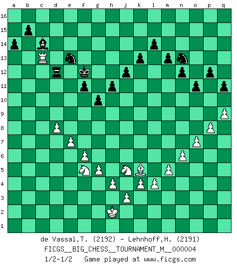 Last move : 1/2-1/2 2011 September 17 1:28:15 [Event "FICGS__BIG_CHESS__TOURNAMENT_M__000004"] [Site "FICGS"] [Date "2010.06.06"] [Round "1"] [White "de Vassal,Thibault"] [Black "Lehnhoff,Heinz-Georg"] [Result "1/2-1/2"] [WhiteElo "2192"] [BlackElo "2191"] 1.j2-k4 g15-g14 2.h1-l4 j15-k13 3.l4-c12 h15-g13 4.c12-c15 b16-c14 5.c15-j9 e15-e13 6.h2-g4 m15-m13 7.e2-e4 h16-m12 8.j9-j7 f16-b12 9.g1-j2 n15-n13 10.b1-c3 p16-q14 11.f1-b5 g16-j15 12.p1-o3 d15-d14 13.k1-h2 b12-c13 14.j7-b7 c14-b12 15.d2-d3 c16-g12 16.b7-k7 g12-f11 17.k7-a7 o16-g9 18.m2-m4 l16-p12 19.l1-p5 k16-h15 20.q2-q4 a15-a14 21.n2-n3 a16-c16 22.o1-f9 l15-l14 23.c1-l9 d14-d13 24.d3-d4 c13-e11 25.a7-a4 p12-k7 26.m4-m5 q14-p12 27.e4-e5 e13-e12 28.a4-a12 e11-c13 29.l9-h6 e12-e11 30.c3-e4 e11-e10 31.f9-m3 b12-c14 32.a12-m12 k13-m12 33.m3-o5 f15-f13 34.g4-j5 k7-j8 35.c2-c4 c13-e11 36.e4-g5 e11-a7 37.c4-c5 j15-k13 38.g5-h7 g9-h10 39.h2-j4 j16-j15 40.j4-k6 j8-m11 41.o3-m4 e16-e12 42.m4-l6 c14-e13 43.k4-h5 e13-g12 44.j2-h4 m16-m14 45.p2-p4 o15-o13 46.e1-e3 e12-d12 47.h4-f5 d12-d11 48.a1-c1 o13-o12 49.c1-c3 p12-n11 50.j1-h2 p15-p13 51.f5-d6 m11-l12 52.m1-m4 a7-e11 53.m4-f4 f11-e12 54.e3-g3 d11-b11 55.a2-a4 q15-q13 56.h6-f8 d13-d12 57.q1-m1 m14-m16 58.m1-m4 c16-c13 59.j5-g6 m16-c16 60.m4-j4 q16-n16 61.h5-j7 d12-d11 62.g6-e7 e10-e9 63.f8-h10 g12-h10 64.j7-g8 h10-g8 65.e7-g8 d11-d10 66.l2-l4 e12-d11 67.g8-f6 d10-d9 68.d6-c4 e9-e8 69.c4-b6 n16-e16 70.a4-a5 c13-a13 71.b2-b4 e11-d10 72.f4-h4 c16-c12 73.k2-k4 e16-e12 74.p5-l9 a13-a7 75.b5-c4 l12-c4 76.c3-c4 d11-b9 77.l9-h6 d10-c9 78.j4-j9 c12-d12 79.j9-q9 q13-q12 80.h4-j4 b9-e6 81.d4-d5 e6-f7 82.j4-j9 c9-b8 83.h6-f4 e8-e7 84.f6-d7 b8-f12 85.j9-l9 m12-n10 86.l9-n9 n10-p11 87.q9-p9 f12-m6 88.p9-p6 m6-o8 89.n9-j9 o8-l11 90.j9-j6 f7-k11 91.p6-p9 n11-o9 92.p9-p8 l11-j13 93.e5-e6 a7-a13 94.f4-e5 k13-m12 95.e5-g7 a13-a9 96.g7-f8 k11-o7 97.p8-g8 o7-k11 98.g8-g10 k11-h13 99.o5-l8 n13-n12 100.c4-j4 m12-o11 101.q4-q5 o9-m10 102.l8-o5 m10-l12 103.g10-c10 d12-d15 104.g3-g10 b11-b13 105.c10-b10 a9-b9 106.b10-b13 b9-b13 107.o5-l2 d9-d8 108.j4-j5 b13-c13 109.g10-b10 e12-e10 110.b10-e10 h13-e10 111.j6-j8 e10-f11 112.j8-q8 h15-f14 113.f2-f4 f14-e12 114.f8-e9 e12-c11 115.e9-j13 l12-j13 116.h7-g9 f11-g12 117.o2-o3 g13-e12 118.j5-j8 c11-b9 119.g9-f7 c13-d13 120.l6-j7 e12-c11 121.j8-e8 c11-e10 122.l2-j4 j13-h11 123.j4-k5 h11-f12 124.k6-h7 b9-c7 125.e8-k8 c7-a6 126.j7-g8 a6-b4 127.g8-h10 g12-h13 128.h10-f9 d13-a13 129.f7-d8 a13-a5 130.d8-e10 h13-e10 131.f9-e7 b4-d3 132.c5-c6 f12-h13 133.k8-a8 a5-b5 134.q8-f8 d3-c5 135.a8-e8 c5-d7 136.b6-d7 e10-b13 137.e8-b8 b5-b8 138.f8-b8 h13-f14 139.n3-n4 p11-n10 140.n4-n5 n10-l11 141.o3-o4 l11-k13 142.p4-p5 b13-c14 143.o4-o5 h14-h13 144.o5-o6 j15-h14 145.h7-j5 j14-j13 146.p5-p6 g14-g13 147.q5-q6 g13-g12 148.q6-q7 k13-j11 149.p6-p7 k15-k13 150.q7-q8 h13-h12 151.h3-h4 j13-j12 152.g2-g4 h14-g13 153.f4-f5 p13-p12 154.b8-c8 d15-d14 155.f5-f6 o11-n13 156.e7-f5 o12-o11 157.d5-d6 q12-q11 158.d7-f8 f14-e12 159.d6-d7 f13-f12 160.e6-e7 f12-f11 161.c8-c10 d14-d10 162.c10-c9 d10-d14 163.c6-c7 g12-g11 164.d7-d8 g13-f12 165.g4-g5 g11-g10 166.c7-c8 j11-g12 167.f8-d9 h12-h11 168.q8-q9 g12-e13 169.p7-p8 d14-d10 170.o6-o7 d10-d12 171.n5-n6 e12-d10 172.c9-c11 d10-c8 173.c11-c8 d12-d9 174.c8-b8 d9-d12 175.b8-c8 d12-b12 176.c8-c9 b12-d12 177.c9-c13 d12-b12 178.c13-c9 b12-d12 179.c9-c13 1/2-1/2 Follow this game move after move (download)I had a toothache during the first game. In the second game I had a headache. In the third game it was an attack of rheumatism. In the fourth game, I wasn't feeling well. And in the fifth game? Well, must one have to win every game ? (Siegbert Tarrasch) Der 70jährige Viktor Kortschnoi: Die Rentenanstalt wollte mich zwingen in Rente zu gehen. Meine Frau erhält jetzt eine Pension- und ich zahle weiter in die Rentenkasse ein! (Viktor Kortschnoi) No volvere nunca a jugar contigo. Has insultado a mi amigo. - cuando un oponente se maldijo por una mala jugada (Miguel Najdorf) Les écrivains ont utilisé les échecs pour analyser les côtés extrêmes de la nature humaine. Dans ce cadre, les échecs offrent un champ d'expérimentation idéal. Mais on pourrait faire la même chose avec la peinture. Et là, en vous référant à Van Gogh, vous ne tirerez pas de conclusion définitive sur les peintres. (Gary Kasparov) Chess is as much a mystery as women. (Purdy)