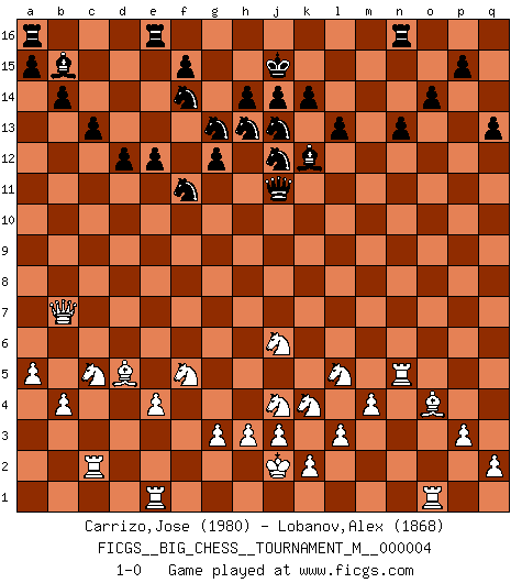 Last move : 1-0 2010 November 21 18:48:59 [Event "FICGS__BIG_CHESS__TOURNAMENT_M__000004"] [Site "FICGS"] [Date "2010.06.06"] [Round "1"] [White "Carrizo,Jose"] [Black "Lobanov,Alex"] [Result "1-0"] [WhiteElo "1980"] [BlackElo "1868"] 1.j2-k4 p16-o14 2.h1-o7 j15-h13 3.o7-c7 h16-o10 4.c7-l15 k16-l14 5.l15-b6 o10-o2 6.m2-m4 o2-o8 7.p1-o3 g16-f14 8.n2-n4 b16-c14 9.l2-l3 n15-n13 10.c2-c3 o14-m13 11.d2-d4 o16-k12 12.o1-l4 g15-g13 13.q1-o1 o8-n9 14.h2-g4 n9-n4 15.m1-n1 n4-k7 16.g2-g3 m15-m14 17.f1-g2 m13-k14 18.g2-f3 d15-d13 19.k1-h2 e15-e13 20.h2-j4 l14-j13 21.g1-j2 o15-o14 22.j1-h2 m16-m15 23.c1-g5 m15-l15 24.l4-k3 c14-d12 25.b1-d2 b15-b14 26.d2-b3 c16-b15 27.b3-c5 k7-p12 28.p2-p3 p12-m12 29.l1-o4 d12-f11 30.k3-m5 g13-g12 31.b2-b4 f16-c13 32.a2-a4 l16-n14 33.a4-a5 c13-h8 34.k4-j6 h8-d4 35.c3-d4 m12-m5 36.j2-k4 m5-h9 37.g4-h6 h15-g13 38.f3-a8 j16-j15 39.e2-e4 q16-l16 40.a8-d5 h9-f9 41.d5-n14 f9-f2 42.h2-j1 l16-n16 43.n14-c4 f2-d4 44.c4-d5 k14-j12 45.a1-a2 d4-c3 46.j1-j2 c3-e5 47.g5-f4 e5-l11 48.n1-n5 l11-j11 49.a2-c2 c15-c13 50.o3-m2 d13-d12 51.m2-k3 e13-e12 52.k3-l5 q15-q13 53.h6-f5 l15-l13 54.f4-n11 k15-k14 55.n11-l13 m14-l13 56.b6-b7 1-0 Follow this game move after move (download)Bobby Fischer's current state of mind is indeed a tragedy. One of the world's greatest Chess players - the pride and sorrow of American Chess. (Frank Brady) Je älter ich werde, um so mehr schätze ich die Bauern. (Paul Keres) Una de estas pequeñas movidas modestas pudieran ser mas molestas a tu oponente que la amenaza mas grande. (Siegbert Tarrasch) RxDa4 pat (...) A woman without a man is like a fish without a bicycle. (Gloria Steinem)