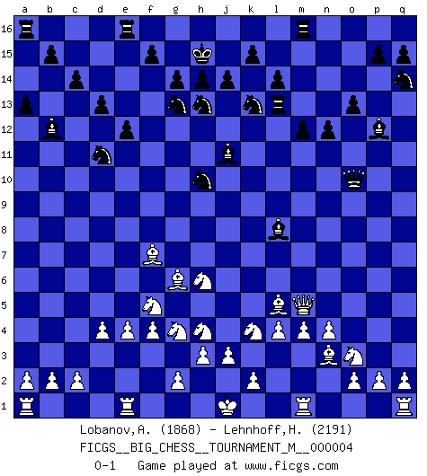 Last move : 0-1 2010 November 21 18:49:6 [Event "FICGS__BIG_CHESS__TOURNAMENT_M__000004"] [Site "FICGS"] [Date "2010.06.06"] [Round "1"] [White "Lobanov,Alex"] [Black "Lehnhoff,Heinz-Georg"] [Result "0-1"] [WhiteElo "1868"] [BlackElo "2191"] 1.j2-k4 g15-g14 2.b1-c3 m15-m13 3.p1-o3 j15-k13 4.h1-l4 h15-g13 5.g1-f3 e15-e13 6.e2-e4 h16-o10 7.h2-g4 n15-n13 8.m2-m4 d15-d13 9.d2-d4 b16-a14 10.c3-e2 p16-q14 11.k1-h2 k16-h15 12.e2-g3 o16-j11 13.h2-j4 l16-p12 14.c1-j7 c15-c14 15.f3-h4 c16-l8 16.g3-f5 m16-m14 17.j4-h6 m14-l14 18.l4-m5 m13-m12 19.f2-f4 e13-e12 20.n2-n4 f16-b12 21.f1-c4 g16-j15 22.c4-h9 g13-f11 23.o1-h7 h15-g13 24.h9-m13 l14-l13 25.h7-g8 l15-l14 26.m13-n12 o15-o13 27.n12-q9 f11-h10 28.g8-f7 h10-k9 29.j7-l5 j16-h15 30.l2-l4 a14-c13 31.m5-j8 c13-d11 32.q9-p8 a15-a13 33.l1-n3 j15-h13 34.p8-m11 k9-h10 35.j8-m5 n13-n12 36.m11-g6 q16-m16 0-1 Follow this game move after move (download)We don't really know how the game was invented, though there are suspicions. As soon as we discover the culprits, we'll let you know. (Bruce Pandolfini) Es hat in meinem Leben Zeiten gegeben, da ich sehr nahe daran war zu glauben, daß ich auch nicht eine einzige Schachpartie verlieren könnte. (José Raúl Capablanca) En manos de Fischer's, una diminuta ventaja teórica es tan buena como tener una Reina de ventaja. (Isaac Kashdan) Dans le domaine de la peinture, de la gravure et de la sculpture, dès la première décennie de notre siècle, les artistes abandonnent la représentation de la partie d'échecs pour se concentrer sur les pièces, sur les échiquiers et sur toutes les variations auxquelles les unes et les autres peuvent donner lieu. On passe en quelque sorte d'un thème social à un thème musical (au sens de la musica médiévale, c'est-à-dire d'une notion qui inclue le rythme, l'harmonie, la construction et la déconstruction, etc.). Graphiquement et picturalement, l'échiquier apparaît comme une structure ouverte, dynamique, d'une richesse infinie, autorisant toutes les combinatoires et débouchant sur des mouvements et des rythmes de nature exponentielle. (Michel Pastoureau) There are 10 types of people in this world: those who understand binary and those who don't. (Anonymous)