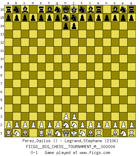 Last move : 0-1 2010 July 6 21:21:20 [Event "FICGS__BIG_CHESS__TOURNAMENT_M__000004"] [Site "FICGS"] [Date "2010.06.06"] [Round "1"] [White "Perez,Dailos"] [Black "Legrand,Stephane"] [Result "0-1"] [WhiteElo ""] [BlackElo "2106"] 0-1 This big chess game has been lost on time (started : 2010.06.06 17:30:32) Follow this game move after move (download)Fischer is the strongest player in the world. In fact, the strongest player who ever lived. (Larry Evans) Wie bekannt hörte Morphy 1859 auf, Schach zu spielen. Seine Enttäuschung galt nicht so sehr dem Schach, wie den Schachspielern. (Robert James Fischer) La pasion por jugar al Ajedrez es una de las mas inexplicables en el mundo. (H.G. Wells) Les échecs sont plus proches de l'art de l'assassinat que de l'art de la guerre. (Arturo Perez-Reverte) The only difference between a tax man and a taxidermist is that the taxidermist leaves the skin. (Mark Twain)