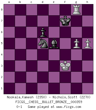 Last move : 0-1 2010 June 8 18:48:41 [Event "FICGS__CHESS__BULLET_BRONZE__000359"] [Site "FICGS"] [Date "2010.06.08"] [Round "1"] [White "Nookala,Kamesh"] [Black "Nichols,Scott"] [Result "0-1"] [WhiteElo "2350"] [BlackElo "2270"] 1.d4 Nf6 2.c4 g6 3.Nc3 Bg7 4.Nf3 O-O 5.e4 d6 6.Be2 Bg4 7.Be3 Nfd7 8.Qd2 c5 9.d5 Na6 10.h3 Bxf3 11.Bxf3 Nc7 12.O-O Re8 13.Be2 a6 14.a3 Rb8 15.a4 Nf8 16.f4 e6 17.e5 f5 18.exf6 Qxf6 19.Bd3 b5 20.axb5 exd5 21.cxd5 axb5 22.f5 Rxe3 23.Qxe3 Qd4 24.Qxd4 Bxd4+ 25.Kh1 c4 26.Be4 b4 27.fxg6 Nxg6 28.Nd1 Nb5 29.g3 Kg7 30.Kg2 Ne5 31.Ra4 Bc5 32.Re1 Rf8 33.Ra1 c3 34.Ra5 Rb8 35.bxc3 Nxc3 36.Nxc3 bxc3 37.Rb1 Rxb1 38.Bxb1 Nc4 39.Ra2 h6 40.Re2 Kf6 41.Re6+ Kg7 42.Rg6+ Kf7 43.g4 Ne3+ 44.Kf3 Nc4 45.Ke2 Na3 46.Bf5 c2 47.Bxc2 Nxc2 48.Rxh6 Nd4+ 49.Kd3 Nf3 50.Ke4 Kg7 51.Rh5 Nd2+ 52.Kd3 Nf3 53.h4 Bg1 54.Ke4 Nd2+ 55.Kf5 Bh2 56.g5 Nb3 57.Rh6 Be5 58.h5 Nd4+ 59.Kg4 Nc2 60.Re6 Ne3+ 61.Kf3 Nxd5 62.Re8 Kf7 63.Rd8 Ke6 64.Rf8 Ke7 65.Rg8 Kf7 0-1 King's Indian defense, 3.Nc3 Kingside Castling by player Black (move 4) Kingside Castling by player White (move 12) 10 pieces endgame at move 47 : White KRPPP , Black KBNPP WHITE : King + 1 Rook 3 Pawns BLACK : King + 1 Bishop 1 Knight 2 Pawns 9 pieces endgame at move 48 : White KRPPP , Black KBNP WHITE : King + 1 Rook 3 Pawns BLACK : King + 1 Bishop 1 Knight 1 Pawn 8 pieces endgame at move 61 : White KRPP , Black KBNP WHITE : King + 1 Rook 2 Pawns BLACK : King + 1 Bishop 1 Knight 1 Pawn Player Black won this chess game. Follow this game move after move (download)In Chess, as it is played by masters, chance is practically eliminated. (Emanuel Lasker) Er war ein guter Schachspieler, aber ich kann Leute nicht ausstehen, die 'Heil Hitler' rufen (Über Alexander Aljechin). (Miguel Najdorf) El Ajedrez es 99 por ciento táctica. (Teichmann) Votre prénom est 'Tactique', votre deuxième prénom est 'Tactique' et votre nom est 'Tactique'. (Ken Smith) Art is the triumph over chaos. (John Cheever)