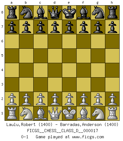 Last move : 0-1 2006 December 14 18:26:57 [Event "FICGS__CHESS__CLASS_D__000017"] [Site "FICGS"] [Date "2006.11.04"] [Round "1"] [White "Laulu,Robert"] [Black "Barradas,Anderson"] [Result "0-1"] [WhiteElo "1400"] [BlackElo "1400"] 0-1 This chess game has been lost on time (started : 2006.11.04 16:22:3) Player Black won this chess game. Follow this game move after move (download)Examine moves that smite! A good eye for smites is far more important than a knowledge of strategical principles. (Purdy) Ich organisiere ein großes Turnier, was mich etwa 120000 Dollar kostet. Ich denke, das ist das erste Mal in der Schachgeschichte, daß ein Schachgroßmeister auch als Mäzen auftritt. (Miguel Najdorf) El tablero es el mundo, las piezas es el fenomeno del universo, las reglas del juego son lo que llamamos leyes de la naturaleza y el jugador del lado opuesto, se encuentra oculto a nuestra vista. (Thomas Huxley) La tactique, c'est ce que vous faites quand il y a quelque chose à faire; la stratégie, c'est ce que vous faites quand il n'y a rien à faire. (Savielli Tartacower) Winning isn't everything... but losing is nothing. (Mednis)