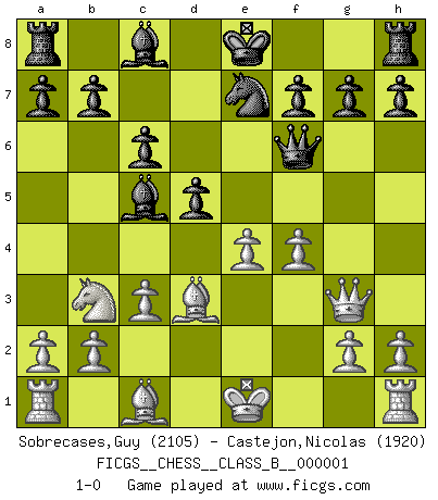 Last move : 1-0 2006 July 1 12:28:44 [Event "FICGS__CHESS__CLASS_B__000001"] [Site "FICGS"] [Date "2006.04.09"] [Round "1"] [White "Sobrecases,Guy"] [Black "Castejon,Nicolas"] [Result "1-0"] [WhiteElo "2105"] [BlackElo "1920"] 1.e4 Nc6 2.d4 e5 3.dxe5 Nxe5 4.Nf3 Nxf3+ 5.Qxf3 Qf6 6.Qg3 Bd6 7.f4 Bb4+ 8.Nd2 d5 9.c3 Bc5 10.Bb5+ c6 11.Bd3 Ne7 12.Nb3 1-0 KP : Nimzovich defense Player White won this chess game. Follow this game move after move (download)It began to feel as though you were playing against Chess itself. - On playing against Robert Fischer. (Walter Shipman) Wie, soll nun auch die Opposition abgeschafft werden? Ja, es tut mir leid, Ihnen diesen Schmerz nicht ersparen zu können. (Aaron Nimzowitsch) El Ajedrez es un cuento de Hadas de las 1001 metidas de pata. (Savielly Tartakower) Le moment que je préfère le plus dans une rencontre, c'est celui où je sens que la personnalité de l'adversaire se brise. (Robert Fischer) I live to kill Traxler counterattack. (Ilmars Cirulis)
