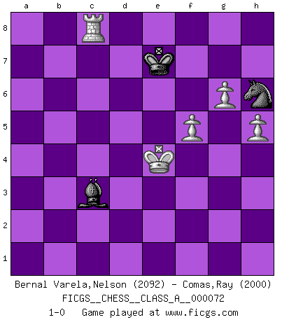 Last move : 1-0 2010 August 20 23:53:39 [Event "FICGS__CHESS__CLASS_A__000072"] [Site "FICGS"] [Date "2010.06.09"] [Round "1"] [White "Bernal Varela,Nelson"] [Black "Comas,Ray"] [Result "1-0"] [WhiteElo "2092"] [BlackElo "2000"] 1.e4 Nf6 2.e5 Nd5 3.d4 d6 4.exd6 cxd6 5.Nf3 g6 6.Bb5+ Bd7 7.Bxd7+ Qxd7 8.O-O Bg7 9.c4 Nb6 10.b3 Nc6 11.Nc3 Qf5 12.Be3 O-O 13.h3 Rac8 14.Re1 Rfe8 15.a3 Nd7 16.Rc1 Qa5 17.b4 Qd8 18.Qb3 b6 19.Red1 Qc7 20.Ng5 Nd8 21.c5 bxc5 22.dxc5 dxc5 23.Nce4 c4 24.Qa4 Nc6 25.Rxc4 Qb7 26.Nxf7 Kxf7 27.Qb3 Na5 28.Rc7 Nxb3 29.Rxb7 Nf6 30.Nd6+ Ke6 31.Nxc8 Rxc8 32.Rb1 Rc3 33.Re1 Ne4 34.Bxa7 Rc1 35.Rxc1 Nxc1 36.a4 Nd6 37.Rb8 Ne2+ 38.Kf1 Nd4 39.Bc5 Ne4 40.Bxd4 Bxd4 41.a5 Nd6 42.a6 Kd7 43.Rh8 h5 44.Rh6 Kc6 45.Rxg6 Kb6 46.Rh6 Kxa6 47.Rxh5 Bc3 48.g4 Bxb4 49.h4 Kb7 50.Re5 Kc6 51.Rxe7 Kd5 52.Re2 Nf7 53.g5 Bd6 54.g6 Nh6 55.Kg2 Be5 56.h5 Kd6 57.Kh3 Kd5 58.Kh4 Bf6+ 59.Kg3 Be5+ 60.f4 Bf6 61.Kf3 Nf5 62.Re8 Kd6 63.Ra8 Ke6 64.Ra6+ Ke7 65.Rb6 Bd4 66.Rc6 Bf6 67.Ra6 Nh6 68.Ke4 Bb2 69.f5 Ng8 70.Ra2 Bc3 71.Ra8 Nh6 72.Rc8 1-0 Alekhine's defense Kingside Castling by player White (move 8) Kingside Castling by player Black (move 12) 10 pieces endgame at move 47 : White KRPPPP , Black KBNP WHITE : King + 1 Rook 4 Pawns BLACK : King + 1 Bishop 1 Knight 1 Pawn 9 pieces endgame at move 48 : White KRPPP , Black KBNP WHITE : King + 1 Rook 3 Pawns BLACK : King + 1 Bishop 1 Knight 1 Pawn 8 pieces endgame at move 51 : White KRPPP , Black KBN WHITE : King + 1 Rook 3 Pawns BLACK : King + 1 Bishop 1 Knight Player White won this chess game. Follow this game move after move (download)We must make sure that Chess will not be like a dead language, very interesting, but for a very small group. (Sytze Faber) Ein guter Spieler hat immer Glück. (José Raúl Capablanca) Cuando le juegas a Fischer, no es una cuestion de si vas a ganar o perder. Es una cuestion de si vas a sobrevivir. (Boris Spassky) Les échecs c'est le défi de l'alpiniste, toujours plus haut, prêt à tout pour monter à l'assaut du Roi ennemi. Les échecs, c'est de la musique en mouvement, un ballet majestueux pour les yeux. C'est de la poésie composée par les fantômes du passé qui au même titre que Rimbaud ou Verlaine méritent notre admiration. Les échecs, c'est de la peinture ou le moindre mouvement modifie le tableau pour en faire un Picasso ou un Van Gogh. Les échecs, c'est tout et rien, c'est la vie et la mort. Jjulie33 sur le forum de France-Echecs. All politicians must be presumed guilty until they are proven innocent. (Dinesh De Silva)
