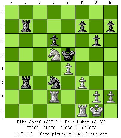 Last move : 1/2-1/2 2010 August 30 11:57:36 [Event "FICGS__CHESS__CLASS_A__000072"] [Site "FICGS"] [Date "2010.06.09"] [Round "1"] [White "Riha,Josef"] [Black "Fric,Lubos"] [Result "1/2-1/2"] [WhiteElo "2054"] [BlackElo "2162"] 1.e4 c5 2.Nf3 d6 3.Bb5+ Bd7 4.Bxd7+ Qxd7 5.c4 Nc6 6.Nc3 Nf6 7.O-O g6 8.d4 cxd4 9.Nxd4 Bg7 10.Nde2 O-O 11.f3 a6 12.Bg5 Ne5 13.b3 b5 14.cxb5 axb5 15.Kh1 Qb7 16.Nd4 b4 17.Bxf6 bxc3 18.Bxg7 Kxg7 19.Ne2 Qb4 20.Rc1 Rxa2 21.Nxc3 Rb2 22.Nd5 Qxb3 23.Qxb3 Rxb3 24.Nxe7 Nd3 25.Rc2 Kf6 26.Nd5+ Ke5 27.Kg1 Rfb8 28.Rd2 R8b7 1/2-1/2 Sicilian : Canal-Sokolsky attack, Sokolsky variation Kingside Castling by player White (move 7) Kingside Castling by player Black (move 10) This chess game ended in a draw. Follow this game move after move (download)Chess is the art of analysis. (Mikhail Botvinnik) Frage des Reporters: -Worin besteht das Ziel von Gambiteröffnungen? Antwort: -Auf Kosten der Partie einen Ruf als Angriffspieler zu erwerben.- (Siegbert Tarrasch) La esencia del Ajedrez es pensar acerca de lo que el Ajedrez es. (David Bronstein) La tactique, c'est ce que vous faites quand il y a quelque chose à faire; la stratégie, c'est ce que vous faites quand il n'y a rien à faire. (Savielli Tartacower) Games, world of games... There's always an opponent, and there's always a victim. (Revolver, movie)