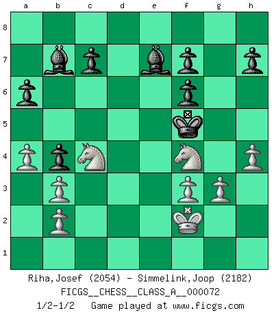 Last move : 1/2-1/2 2010 June 14 18:40:45 [Event "FICGS__CHESS__CLASS_A__000072"] [Site "FICGS"] [Date "2010.06.09"] [Round "1"] [White "Riha,Josef"] [Black "Simmelink,Joop"] [Result "1/2-1/2"] [WhiteElo "2054"] [BlackElo "2182"] 1.e4 e5 2.Nf3 Nc6 3.Bb5 a6 4.Ba4 Nf6 5.O-O Be7 6.Re1 b5 7.Bb3 O-O 8.a4 b4 9.d4 d6 10.dxe5 dxe5 11.Qxd8 Rxd8 12.Nbd2 Bc5 13.h3 Bb7 14.Nc4 Nd4 15.Be3 Bxe4 16.Nfxe5 Re8 17.f3 Bd5 18.Rad1 Nxb3 19.cxb3 Bf8 20.Bg5 Be6 21.Bxf6 gxf6 22.Nc6 Bf5 23.Rxe8 Rxe8 24.Rd2 Bc8 25.Kf1 Kg7 26.Nd4 Be7 27.Re2 Bd7 28.Re1 Kg6 29.h4 Bf8 30.Rxe8 Bxe8 31.Ne2 Bc6 32.Kf2 Bb7 33.Nf4+ Kf5 34.g3 Be7 1/2-1/2 Ruy Lopez : Closed, 7...O-O Kingside Castling by player White (move 5) Kingside Castling by player Black (move 7) This chess game ended in a draw. Follow this game move after move (download)It is no time to be playing Chess when the house is on fire. (Italian Proverb) Es ist besser die Steine des Gegners zu opfern. (Savielly Grigorievitsch Tartakower) Las combinaciones han sido siempre el aspecto más intrigante del Ajedrez. Los Maestros las buscan, el público las aplauden, los críticos las alaban. La razón se debe a que las combinaciones hacen posible que el Ajedrez sea más que un ejercicio matemático con una carencia de vida. Ellas son la poesía del juego, son del Ajedrez lo que la melodía es de la música. Ellas representan el triunfo de la mente sobre la materia. (Reuben Fine) Donnez-moi un Cavalier en 6e et je gagnerais toutes mes parties. (Steinitz) There is a very easy way to return from a casino with a small fortune : go there with a large one. (Jack Yelton)