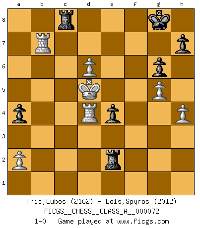 Last move : 1-0 2011 March 4 18:20:5 [Event "FICGS__CHESS__CLASS_A__000072"] [Site "FICGS"] [Date "2010.06.09"] [Round "1"] [White "Fric,Lubos"] [Black "Lois,Spyros"] [Result "1-0"] [WhiteElo "2162"] [BlackElo "2012"] 1.d4 Nf6 2.c4 g6 3.Nc3 d6 4.Nf3 Bg7 5.e4 O-O 6.Be2 e5 7.O-O Nc6 8.d5 Ne7 9.b4 Nh5 10.Re1 f5 11.Ng5 Nf6 12.Bf3 fxe4 13.Ncxe4 Nf5 14.Bb2 a5 15.b5 Nxe4 16.Nxe4 Nd4 17.Bxd4 exd4 18.Bg4 Bxg4 19.Qxg4 Qc8 20.h3 Rf5 21.b6 Qd7 22.bxc7 Qxc7 23.Rac1 Raf8 24.Qd1 Be5 25.Qd3 Qf7 26.Rc2 b6 27.Rb1 Qc7 28.Rb5 Bg7 29.Rcb2 Rb8 30.g4 Re5 31.Kg2 Kh8 32.Nd2 R5e8 33.Nf3 Bf6 34.R2b3 Rec8 35.g5 Be5 36.Nxd4 Qxc4 37.Nc6 Qxd3 38.Rxd3 Rb7 39.h4 a4 40.Nxe5 dxe5 41.d6 Kg7 42.Kf3 Rf7+ 43.Ke4 Rxf2 44.Rxb6 Re2+ 45.Kd5 e4 46.Rb7+ Kg8 47.Rd4 1-0 King's Indian defense, 3.Nc3 Kingside Castling by player Black (move 5) Kingside Castling by player White (move 7) Player White won this chess game. Follow this game move after move (download)The older I grow, the more I value pawns. (Paul Keres) Die starken Figuren des Gegners muss man abtauschen. (José Raúl Capablanca) Robert Fischer es la ley hacia si mismo. (Larry Evans) Botvinnik disait en comparant les échecs à la musique: Il existe une science dont le but est l'étude de l'acoustique et des sons. Mais il y a aussi un art qui se sert de l'océan des sons : c'est la musique. De toute évidence, il en est de même pour la pensée. La logique est l'étude des lois de la réflexion et les échecs reflètent, en tant qu'art, le côté logique de la réflexion, sous la forme d'images artistiques... Extrait de Fischer - Spassky, Reykjavik 1972 par Alexander & F. Wyndham (Ed. Solar), p 37. All maxims have their antagonist maxims; proverbs should be sold in pairs, a single one being but a half truth. (William Mathews)