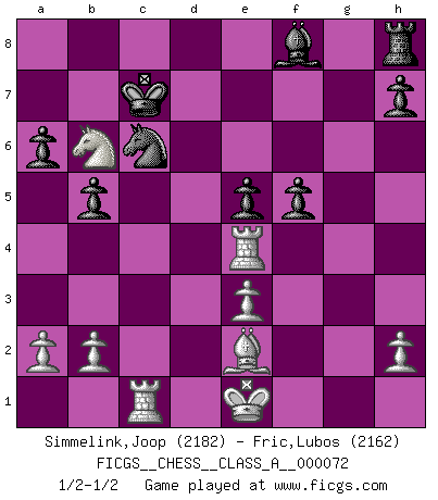 Last move : 1/2-1/2 2010 August 25 20:34:38 [Event "FICGS__CHESS__CLASS_A__000072"] [Site "FICGS"] [Date "2010.06.09"] [Round "1"] [White "Simmelink,Joop"] [Black "Fric,Lubos"] [Result "1/2-1/2"] [WhiteElo "2182"] [BlackElo "2162"] 1.e4 c5 2.Nf3 e6 3.d4 cxd4 4.Nxd4 a6 5.Nc3 d6 6.Be3 Nf6 7.g4 e5 8.Nf5 g6 9.g5 gxf5 10.exf5 d5 11.gxf6 d4 12.Bc4 Bxf5 13.Qh5 Qxf6 14.Nd5 Qg6 15.Qh4 Bxc2 16.Nc7+ Kd7 17.Nxa8 b5 18.Be2 dxe3 19.Rc1 Nc6 20.Nb6+ Kd6 21.fxe3 Qe4 22.Qxe4 Bxe4 23.Rg1 Kc7 24.Rg4 f5 25.Rxe4 1/2-1/2 Sicilian : Kan, 5.Nc3 This chess game ended in a draw. Follow this game move after move (download)I guess a certain amount of temperament is expected of Chess geniuses. (Ron Gross) Wenn ich gewinne bin ich ein Genie. Wenn nicht, dann bin ich keines. (Robert James Fischer) Todo lo que importa ante el tablero de Ajedrez son buenas jugadas. (Bobby Fischer) La vérité est comme le meilleur coup aux échecs : elle existe, mais il faut la chercher. (Arturo Perez-Reverte) If you know the enemy and know yourself you need not fear the results of a hundred battles. (Sun Tzu)