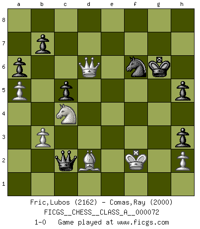Last move : 1-0 2011 March 12 23:52:0 [Event "FICGS__CHESS__CLASS_A__000072"] [Site "FICGS"] [Date "2010.06.09"] [Round "1"] [White "Fric,Lubos"] [Black "Comas,Ray"] [Result "1-0"] [WhiteElo "2162"] [BlackElo "2000"] 1.d4 Nf6 2.c4 g6 3.Nc3 Bg7 4.e4 d6 5.Be2 O-O 6.Bg5 c5 7.d5 h6 8.Bf4 a6 9.a4 e6 10.Nf3 exd5 11.cxd5 g5 12.Bc1 Re8 13.Qc2 Qe7 14.Nd2 Nbd7 15.a5 Ne5 16.O-O Bd7 17.Re1 Rad8 18.Ra3 g4 19.Rb3 Bc8 20.Na4 Qc7 21.Nb6 Ned7 22.Nbc4 Nf8 23.Re3 h5 24.Nb6 Ng6 25.Ndc4 Bd7 26.Bf1 Bb5 27.b3 Bxc4 28.Nxc4 Qe7 29.Rd3 Nd7 30.f4 f5 31.Rde3 Bd4 32.exf5 Nxf4 33.Bb2 Bxe3+ 34.Rxe3 Qg5 35.Bc1 Rxe3 36.Bxe3 Nf6 37.Qd2 Nh3+ 38.gxh3 Qxf5 39.Bh6 Rd7 40.Qe3 Nxd5 41.Qe8+ Kh7 42.Bg5 gxh3 43.Bd3 Qxd3 44.Qxd7+ Kg6 45.Be3 Qb1+ 46.Kf2 Qc2+ 47.Bd2 Nf6 48.Qxd6 1-0 This chess game has been lost on time (started : 2010.06.09 8:53:10) King's Indian : Averbakh, 6...c5 Kingside Castling by player Black (move 5) Kingside Castling by player White (move 16) Player White won this chess game. Follow this game move after move (download)After black's reply to 1.e4 with 1..e5, leaves him always trying to get into the game. (Howard Staunton) Kann Schach nicht schließlich das Nationalspiel der Deutschen werden? Und welche weiteren Ausblicke bieten sich dann dar! Welche Hebung des allgemeinen Kultur-Niveaus, ja der Moral, wenn das Schachbrett den Kartentisch verdrängen würde! Wahrlich, ein Ziel, des Schweißes der Edlen wert! (Siegbert Tarrasch) El Ajedrez era la lengua materna de Capablanca. (Reti) A chaque perte on perd un peu de soi. (Joël Lautier) If you have any trouble condescending, find a Unix user to show you how it's done. (Scott Adams)