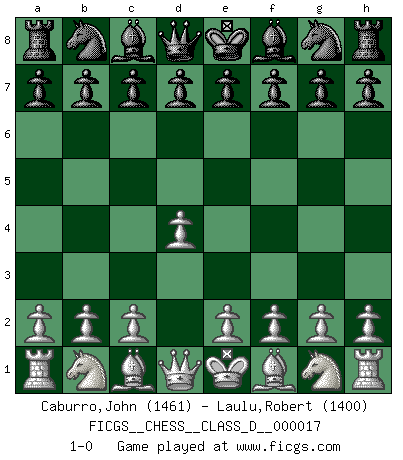 Last move : 1-0 2006 December 14 18:26:57 [Event "FICGS__CHESS__CLASS_D__000017"] [Site "FICGS"] [Date "2006.11.04"] [Round "1"] [White "Caburro,John"] [Black "Laulu,Robert"] [Result "1-0"] [WhiteElo "1461"] [BlackElo "1400"] 1.d4 1-0 This chess game has been lost on time (started : 2006.11.04 16:22:3) Queen's pawn Player White won this chess game. Follow this game move after move (download)Later, I began to succeed in decisive games. Perhaps because I realized a very simple truth: not only was I worried, but also my opponent. (Mikhail Tal) Immer nach dem besten Zug zu suchen ist ziemlich unpraktisch. (Nigel Short) El Ajedrez, como cualquier actividad creativa, solo puede existir a través del esfuerzo combinado de aquellos que tienen talento creativo y de aquellos que poseen la habilidad de organizar su trabajo creativo. (Mikhail Botvinnik) Si rien de grave n'est détecté lors de l'analyse d'une position, on joue alors le coup. Seconde règle de Blumenfeld. Everything in life is luck. (Donald Trump)