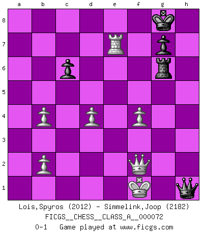 Last move : 0-1 2010 July 5 16:6:49 [Event "FICGS__CHESS__CLASS_A__000072"] [Site "FICGS"] [Date "2010.06.09"] [Round "1"] [White "Lois,Spyros"] [Black "Simmelink,Joop"] [Result "0-1"] [WhiteElo "2012"] [BlackElo "2182"] 1.e4 e5 2.Nf3 Nc6 3.Bb5 a6 4.Ba4 Nf6 5.O-O Be7 6.Re1 b5 7.Bb3 O-O 8.c3 d5 9.exd5 Nxd5 10.Nxe5 Nxe5 11.Rxe5 c6 12.d4 Bd6 13.Re1 Qh4 14.g3 Qh3 15.Be3 Bg4 16.Qd3 Rae8 17.Nd2 Re6 18.a4 Qh5 19.axb5 axb5 20.Nf1 Bf5 21.Qd2 Be4 22.Bd1 Qg6 23.Qe2 b4 24.Bd2 Nf6 25.cxb4 h5 26.Ra3 h4 27.Ne3 Bc7 28.Ng4 hxg3 29.hxg3 Bd5 30.Nxf6+ Qxf6 31.Re3 Qf5 32.Rxe6 fxe6 33.f4 Rf6 34.Qf2 e5 35.Bf3 exf4 36.Bxd5+ Qxd5 37.Bxf4 Bxf4 38.gxf4 Rg6+ 39.Kf1 Qh5 40.Re7 Qh1+ 0-1 Ruy Lopez : Closed, 7...O-O Kingside Castling by player White (move 5) Kingside Castling by player Black (move 7) Player Black won this chess game. Follow this game move after move (download)Daring ideas are like Chess men moved forward. They may be beaten, but they may start a winning game. (Johann Wolfgang von Goethe) Nur ein wirklich starker Spieler weiß wie schwach er spielt. (Savielly Grigorievitsch Tartakower) El jugador táctico debe saber que hacer cuando algo se debe de hacer. El estratégico debe saber que hacer cuando nada se debe de hacer. (Savielly Tartakover) Soyez une menace à chaque fois que vous vous asseyez pour jouer. (Ken Smith) As the days dwindle down... to a precious few. (Maxwell Anderson)