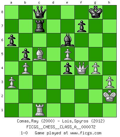 Last move : 1-0 2010 July 14 19:3:35 [Event "FICGS__CHESS__CLASS_A__000072"] [Site "FICGS"] [Date "2010.06.09"] [Round "1"] [White "Comas,Ray"] [Black "Lois,Spyros"] [Result "1-0"] [WhiteElo "2000"] [BlackElo "2012"] 1.e4 e5 2.Nf3 Nc6 3.Bb5 a6 4.Ba4 Nf6 5.O-O b5 6.Bb3 Be7 7.Re1 d6 8.c3 O-O 9.h3 Na5 10.Bc2 c5 11.d4 Qc7 12.Nbd2 cxd4 13.cxd4 Nc6 14.Nb3 Bd7 15.Be3 Nb4 16.Bb1 Rfc8 17.Qd2 exd4 18.Nfxd4 Nc6 19.Rc1 Qd8 20.Nxc6 Rxc6 21.Bd3 Rxc1+ 22.Rxc1 Rc8 23.Nd4 d5 24.e5 Ne4 25.Qd1 g6 26.a3 Rc7 27.b4 Qb8 28.f4 Bh4 29.Nb3 Be7 30.Bxe4 dxe4 31.Nc5 Bxc5 32.Bxc5 Bf5 33.g4 Be6 34.Qd4 Qa8 35.Qe3 h6 36.f5 gxf5 37.Qxh6 Qc8 38.Kh2 f4 39.Qxf4 1-0 Ruy Lopez : 5.O-O Kingside Castling by player White (move 5) Kingside Castling by player Black (move 8) Player White won this chess game. Follow this game move after move (download)A Chess game is a dialogue, a conversation between a player and his opponent. Each move by the opponent may contain threats or be a blunder, but a player cannot defend against threats or take advantage of blunders if he does not first ask himself: What is my opponent planning after each move ? (Bruce A. Moon) Aljechin war kein Nazi. Er war ein Opportunist. Ein schrecklicher Mann. Er liebte Geld über alles und würde für Geld ein Jude, ein Katolik oder ein Protestant werden. (Miguel Najdorf) La maestría del Ajedrez consiste esencialmente en analizar posiciónes de Ajedrez con precisión. (Mikhail Botvinnik) Aux échecs, l'amour-propre est satisfait quand on remporte la victoire, mais il n'y a pas de honte à être battu. (Benjamin Franklin) Wikichess, chess moves explained by 'experimented' players. (Thibault de Vassal)