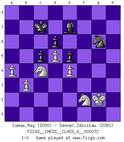 Last move : 1-0 2010 December 12 15:10:5 [Event "FICGS__CHESS__CLASS_A__000072"] [Site "FICGS"] [Date "2010.06.09"] [Round "1"] [White "Comas,Ray"] [Black "Sanner,Zdzislaw"] [Result "1-0"] [WhiteElo "2000"] [BlackElo "2081"] 1.d4 Nf6 2.c4 g6 3.Nc3 Bg7 4.e4 O-O 5.Nf3 d6 6.Be2 Nc6 7.O-O e5 8.d5 Ne7 9.Ne1 Ne8 10.Nd3 f5 11.Bd2 Nf6 12.f3 f4 13.c5 g5 14.Qb3 Ng6 15.Rac1 Rf7 16.Rc2 Bf8 17.cxd6 cxd6 18.Rfc1 g4 19.fxg4 Bxg4 20.Nf2 Bxe2 21.Nxe2 h5 22.Rc4 a5 23.Qh3 Qd7 24.Qxd7 Nxd7 25.Rc8 Rxc8 26.Rxc8 b6 27.g3 Kh7 28.Rc6 fxg3 29.hxg3 Ne7 30.Rc7 Nc5 31.Be3 Rg7 32.Kg2 Kg8 33.Bxc5 bxc5 34.b3 h4 35.Ra7 hxg3 36.Nxg3 Ng6 37.Rxg7+ Kxg7 38.Nf5+ Kf7 39.Ne3 Ke8 40.a4 Kd7 41.Nc4 Kc7 42.Nxa5 Be7 43.Nc4 1-0 King's Indian : 4.e4 Kingside Castling by player Black (move 4) Kingside Castling by player White (move 7) Player White won this chess game. Follow this game move after move (download)I am the best player in the world and I am here to prove it. (Bobby Fischer) Das ganze Leben mit einer Ehefrau ist wie ein Endspiel mit ungleichfarbigen Läufern. (Viktor Kortschnoi) La belleza de un movimiento no se refleja solo en su apariencia, sino en el pensamiento detrás de él. (Siegbert Tarrasch) Une platitude souvent récitée à propos des Echecs est qu'une des choses les plus difficiles à réaliser est de gagner une position gagnante. Cela ne manque pas de sens mais, pour ma part, j'ai toujours trouvé plus difficile de gagner une position perdante. (Tim Krabbe) There's always a bigger fish. (Qui-Gon Jinn in Star Wars ep.1)