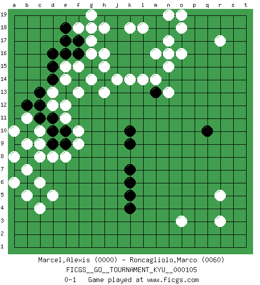 Last move : 0-1 2010 July 3 23:11:9 [Event "FICGS__GO__TOURNAMENT_KYU__000105"] [Site "FICGS"] [Date "2010.06.09"] [Round "1"] [Black "Marcel,Alexis"] [White "Roncagliolo,Marco"] [Result "0-1"] [Rating 1 "0000"] [Rating 2 "0060"] 1.k10 c4 2.d10 r3 3.d16 r17 4.k16 c6 5.q10 r5 6.k4 o3 7.k6 o16 8.k5 c9 9.e10 c10 10.d9 d8 11.e9 e8 12.l16 m16 13.m15 n17 14.l15 m14 15.m17 n16 16.l17 k14 17.k15 l14 18.j16 j14 19.j15 h15 20.h17 h16 21.j17 g17 22.j18 g18 23.j19 n15 24.n18 o18 25.m18 n19 26.l19 o19 27.m19 h18 28.h19 g19 29.k19 k18 30.k17 l18 31.k9 f9 32.d11 f10 33.c11 e11 34.c12 e12 35.b12 d12 36.c13 d13 37.d14 e14 38.d15 e15 39.e16 f15 40.b10 b9 41.a9 c8 42.b8 b7 43.a7 a8 44.e17 a10 45.b6 b5 46.f16 b11 47.g15 g14 48.h14 g16 49.e13 f13 50.f17 h13 51.c5 d5 52.k7 f18 53.e18 a6 54.m13 n13 0-1 Here are the names of the openings (joseki) played in the four corners : Player White won this Go (weiqi, baduk) game. Follow this game move after move (download)Pon-nuki is worth thirty points. (Anonymous) If computers get too powerful, we can organize them into committees. That'll do them in. (Anonymous)