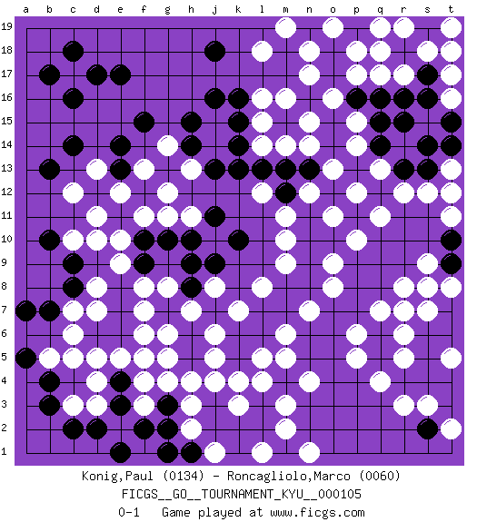 Last move : 0-1 2010 November 23 22:38:22 [Event "FICGS__GO__TOURNAMENT_KYU__000105"] [Site "FICGS"] [Date "2010.06.09"] [Round "1"] [Black "Konig,Paul"] [White "Roncagliolo,Marco"] [Result "0-1"] [Rating 1 "0134"] [Rating 2 "0060"] 1.k10 c3 2.g7 r17 3.o15 c17 4.f15 r3 5.q16 p17 6.q14 n17 7.t15 o16 8.o14 q17 9.q15 n15 10.p16 n14 11.p13 o13 12.k16 m16 13.l13 p12 14.s17 q13 15.r13 p14 16.r16 r12 17.s13 p15 18.t18 s12 19.r18 q18 20.s19 q19 21.t12 t11 22.t14 r19 23.o18 t13 24.o17 s18 25.c14 t19 26.e17 n18 27.n19 m19 28.p19 o19 29.c18 p18 30.c16 t17 31.s16 s15 32.s14 t16 33.r15 t18 34.d17 t12 35.b17 c6 36.c8 f3 37.d6 c5 38.d5 d4 39.f10 d7 40.e6 f6 41.e7 d8 42.e8 e9 43.f9 e10 44.e11 d10 45.c9 c10 46.b10 d11 47.f12 e12 48.d12 f11 49.f5 g6 50.h6 g5 51.e4 f4 52.f2 e5 53.e3 f5 54.h5 h4 55.g3 h3 56.g2 g4 57.j3 j4 58.k4 k3 59.j2 j5 60.k5 j6 61.k6 h7 62.j7 k7 63.h8 j8 64.j9 g8 65.h9 f8 66.d2 f7 67.g10 l4 68.m4 l5 69.l6 m6 70.l7 l8 71.m7 n7 72.m8 m9 73.n8 o8 74.n9 o9 75.n10 m10 76.n11 m11 77.m12 n12 78.o10 p10 79.p11 q11 80.o12 o11 81.l3 m3 82.l2 n4 83.a7 m5 84.e1 c7 85.b7 d13 86.e13 c12 87.b13 d3 88.a5 m2 89.k2 k4 90.m1 n1 91.k1 l1 92.h1 f13 93.e14 g12 94.h14 l18 95.j18 g11 96.h10 h11 97.j11 h13 98.j13 g14 99.r7 q4 100.q6 p5 101.b3 l12 102.m13 l14 103.k13 j14 104.h15 h2 105.c2 j1 106.g1 m14 107.k14 j15 108.j16 l16 109.k15 l15 110.q5 p6 111.r4 q7 112.s6 r5 113.s4 r6 114.s8 r8 115.t7 s7 116.t9 r7 117.s5 s3 118.t4 s9 119.b4 d5 120.t10 t8 121.t6 s8 122.t3 t2 123.s2 t5 124.n13 b5 0-1 Here are the names of the openings (joseki) played in the four corners : Corner d4 : c3 g7 San-San (Sam-Sam, San-San) 3-3 Point. The San-San (3-3) point, emphasizing territory at the expense of influence. Corner q16 : r17 o15 San-San (Sam-Sam, San-San) 3-3 Point. The San-San (3-3) point, emphasizing territory at the expense of influence. Corner d16 : c17 f15 San-San (Sam-Sam, San-San) 3-3 Point. The San-San (3-3) point, emphasizing territory at the expense of influence. Player White won this Go (weiqi, baduk) game. Follow this game move after move (download)A meijin needs no joseki. (Anonymous) I believe in luck. How else can you explain the success of those you dislike ? (Jean Cocteau)