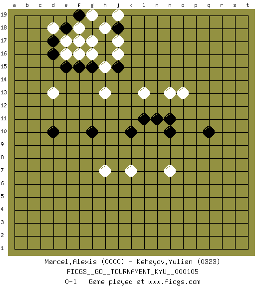 Last move : 0-1 2010 July 8 22:32:29 [Event "FICGS__GO__TOURNAMENT_KYU__000105"] [Site "FICGS"] [Date "2010.06.09"] [Round "1"] [Black "Marcel,Alexis"] [White "Kehayov,Yulian"] [Result "0-1"] [Rating 1 "0000"] [Rating 2 "0323"] 1.k10 h13 2.d10 n7 3.g10 l13 4.q10 k7 5.n10 o13 6.n11 n13 7.m11 h7 8.l11 d13 9.d16 e17 10.d17 e16 11.e15 g16 12.e18 f16 13.f17 f18 14.f19 g17 15.g18 f17 16.h17 h18 17.h16 h15 18.j15 j16 19.f15 j17 20.h19 g19 21.j18 j19 22.g15 d18 0-1 Here are the names of the openings (joseki) played in the four corners : Corner d4 : h7 0-1 This joseki is unknown. A weak or weird move has probably been played in this corner. Player White won this Go (weiqi, baduk) game. Follow this game move after move (download)Play slow, win slow; play fast, lose fast. (Anonymous) Computers make it easier to do a lot of things, but most of the things they make it easier to do don't need to be done. (Andy Rooney)