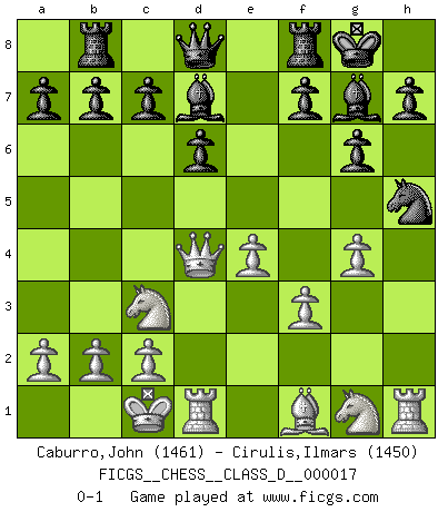 Last move : 0-1 2007 May 3 19:37:43 [Event "FICGS__CHESS__CLASS_D__000017"] [Site "FICGS"] [Date "2006.11.04"] [Round "1"] [White "Caburro,John"] [Black "Cirulis,Ilmars"] [Result "0-1"] [WhiteElo "1461"] [BlackElo "1450"] 1.d4 d6 2.e4 g6 3.Nc3 Bg7 4.Be3 Nf6 5.Qd2 O-O 6.f3 Bd7 7.O-O-O Nc6 8.g4 Rb8 9.h4 e5 10.h5 exd4 11.Bxd4 Nxd4 12.Qxd4 Nxh5 0-1 Queen's Pawn Kingside Castling by player Black (move 5) Queenside Castling by player White (move 7) Player Black won this chess game. Follow this game move after move (download)All I want to do, ever, is just play Chess. (Bobby Fischer) Um sich vor der Gefahr einer Erkältung zu schützen, sorge der wanderlustige König beizeiten für ein brauchbares Versteck. (Aaron Nimzowitsch) Desconfianza es la característica mas necesaria de un jugador de Ajedrez. (Siegbert Tarrasch) La menace est plus forte que l'exécution. (Aaron Nimzovitch) Those parts of the system that you can hit with a hammer (not advised) are called hardware; those program instructions that you can only curse at are called software. (Anonymous)