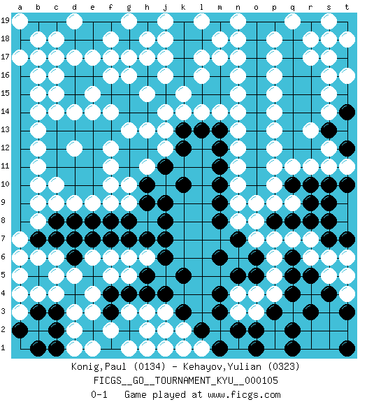 Last move : 0-1 2010 September 2 23:23:57 [Event "FICGS__GO__TOURNAMENT_KYU__000105"] [Site "FICGS"] [Date "2010.06.09"] [Round "1"] [Black "Konig,Paul"] [White "Kehayov,Yulian"] [Result "0-1"] [Rating 1 "0134"] [Rating 2 "0323"] 1.k10 c5 2.f7 j16 3.f15 p5 4.m3 q11 5.r3 p16 6.f3 d3 7.b7 c6 8.c7 b6 9.d6 d5 10.e5 e4 11.f4 e3 12.g2 e6 13.d7 f5 14.a8 g5 15.a6 a5 16.a4 a7 17.b3 a6 18.a2 b8 19.a9 b9 20.a10 b10 21.a11 b11 22.a12 b12 23.a13 b13 24.a14 b14 25.a15 b15 26.a16 b16 27.a17 b17 28.a18 b18 29.b19 c18 30.d18 d17 31.e18 e17 32.f19 g17 33.f17 f16 34.g18 h17 35.e16 g16 36.g15 e15 37.d16 c17 38.d15 e14 39.e13 d14 40.d13 c14 41.g14 f14 42.f13 g13 43.c13 h13 44.h14 j14 45.o5 o7 46.c19 h18 47.q5 p6 48.q6 q7 49.q4 p4 50.p3 f12 51.e12 f11 52.e11 f10 53.e10 e9 54.d10 d9 55.c11 d12 56.c12 c9 57.d11 c10 58.o6 p7 59.n7 n8 60.m8 n9 61.m9 n10 62.m10 n11 63.m11 n12 64.m12 n13 65.m13 m14 66.m6 r6 67.r5 s6 68.s4 s5 69.t5 t6 70.t3 r7 71.s9 s11 72.s8 q9 73.t7 n14 74.t10 t11 75.s10 r11 76.s7 r17 77.q8 o8 78.r8 l14 79.p8 p9 80.r9 k14 81.l13 j13 82.k13 f9 83.h19 j19 84.k19 j18 85.k18 l17 86.k17 l16 87.l18 m18 88.m19 n18 89.k16 k15 90.c3 d2 91.e2 d1 92.f1 e1 93.b1 b4 94.c2 a3 95.c1 a4 96.e7 f6 97.g7 f2 98.h1 g1 99.j2 g3 100.g4 h2 101.h4 h3 102.k1 j1 103.h5 h1 104.k3 j3 105.l2 k2 106.m1 j2 107.j4 l1 108.n2 k1 109.c8 a19 110.a18 f18 111.o19 f17 112.o18 m17 113.q18 r18 114.r19 s18 115.p19 p17 116.o17 n17 117.o16 p15 118.q17 p14 119.q16 s16 120.r16 s15 121.q15 s19 122.o15 p13 123.o14 p12 124.o13 p11 125.o12 p10 126.o11 o9 127.o10 s17 128.q14 s14 129.q13 t18 130.q12 t16 131.h7 h15 132.j7 g6 133.j6 h6 134.k5 o4 135.n5 n4 136.m4 n3 137.q2 a17 138.j8 c4 139.h9 g9 140.h10 h11 141.j11 j12 142.k12 g10 143.j9 a19 144.e19 d19 145.d8 g19 146.e8 d12 147.g8 j17 148.f8 l19 149.r12 n19 150.o1 c15 151.q1 c16 152.r15 o3 153.o2 t4 154.t1 t5 155.r10 n15 156.q10 n16 157.s13 q19 158.t14 p18 159.t12 s12 160.r14 r13 0-1 Here are the names of the openings (joseki) played in the four corners : Corner d4 : c5 f7 Mokuhazushi (Waemok, Wai`mu`) 5-3 Point. The mokuhazushi (5-3) point was popular in the Edo period in Japan (1600 - 1867). It emphasizes influence; territorially, it is inferior to the 3-4 point. Corner d16 : j16 f15 This joseki is unknown. A weak or weird move has probably been played in this corner. Corner q4 : p5 m3 Go-no-go (Wu~wu~) 5-5 Point. The 5-5 was experimented with briefly during the "New Fuseki" movement in Japan in the 1930s. The 5-5 point has not retained popularity because the 4-4 hoshi (star) point strikes a better balance between influence and territory. As one can see from the variations, though, the 5-5 is playable. Player White won this Go (weiqi, baduk) game. Follow this game move after move (download)Beware of the clumsy double contact. (Anonymous) Work expands to fill the time available. (C. Northcote Parkinson, in Parkinson's Laws)