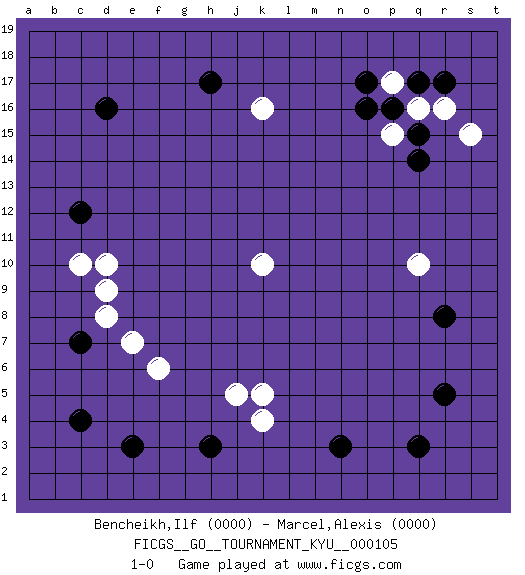 Last move : 1-0 2010 July 10 7:9:33 [Event "FICGS__GO__TOURNAMENT_KYU__000105"] [Site "FICGS"] [Date "2010.06.09"] [Round "1"] [Black "Bencheikh,Ilf"] [White "Marcel,Alexis"] [Result "1-0"] [Rating 1 "0000"] [Rating 2 "0000"] 1.q3 k10 2.e3 k16 3.d16 d10 4.c12 q10 5.r5 q16 6.c4 k4 7.c7 c10 8.h17 d9 9.h3 d8 10.n3 k5 11.r8 e7 12.q14 f6 13.o16 j5 14.r17 r16 15.q17 p17 16.p16 s15 17.o17 p15 18.q15 1-0 Here are the names of the openings (joseki) played in the four corners : Corner q16 : q16 q14 Hoshi (Hwajeom, Seongjeom, Xingwei`) 4-4 Point. The star or hoshi (4-4) point, emphasizing influence at the potential expense of territory. Ikken Takagakari (Hankan Nop'dakeolch'im, Yi Gaojia, 1-Space High Approach). White typically responds at 6-4 or 3-10. White 4-10 is played when White finds play on the right side advantageous. White 4-8 or 3-8 may be played when White has support at top. Player Black won this Go (weiqi, baduk) game. Follow this game move after move (download)With only one group, you will win. (Anonymous) Every vice is only an exaggeration of a necessary and virtuous function. (Ralph Waldo Emerson, Journals 1936)